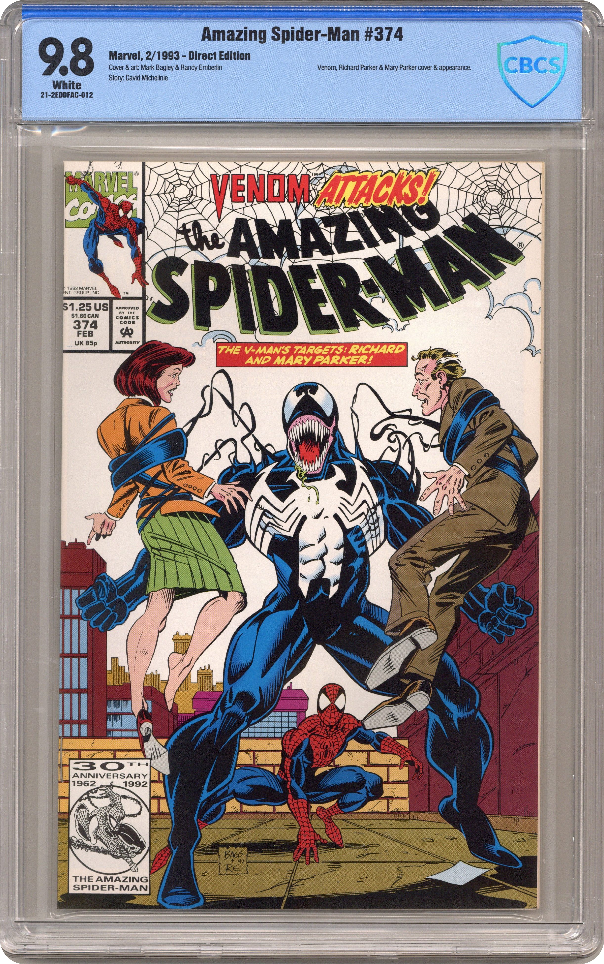 Ended Feb 6 2024 Winning Bid $51 Direct Edition. "Murder on Parade" Part 1 of 2. Script by David Michelinie. Pencils by Mark Bagley. Inks by Randy Emberlin. Cover by Mark Bagley and Randy Emberlin. Several days ago, Richard and Mary Parker experienced the upside of having a son who is a superhero. But today they experience the downside...in spades! Venom believes that the Parkers need protection from their web-slinging son! So, the Lethal Protector tries to kidnap them! But the amazing one won't let that happen without a fight! And what a fight it is! Venom and the wall-crawler battle from block to block for the same goal: saving the Parkers! Truly a bizarre twist! Cameo appearances by Mary Jane Watson, Aunt May, Ben Urich, Joy Mercado, and J. Jonah Jameson. (Note: The letters page previews the cover to Amazing Spider-Man 375.) 36 pgs. Cover price $1.25. Grade: CBCS 9.8 explanation of grade Condition: Used (collectible)