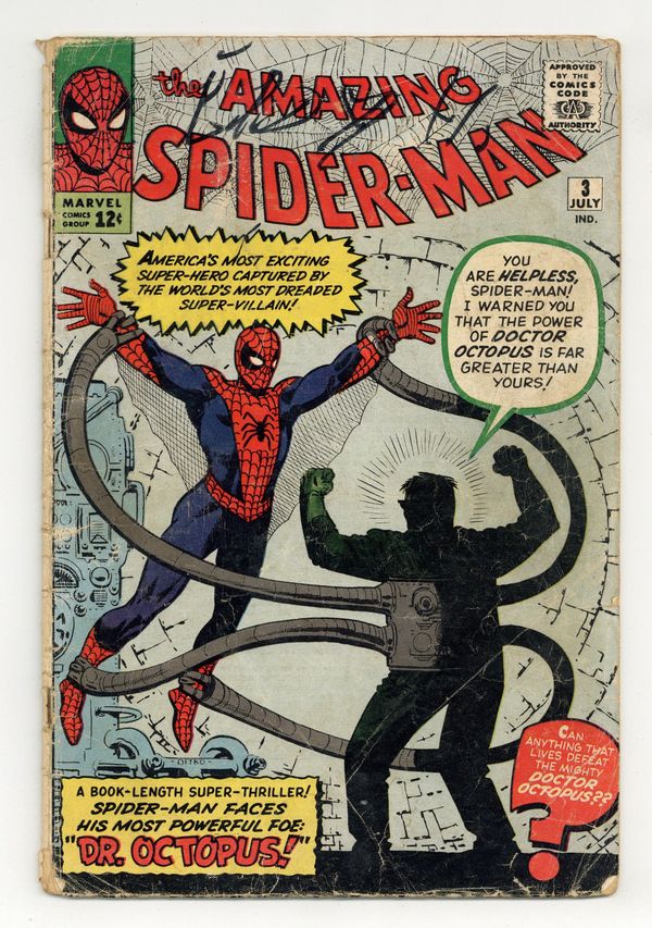 Cover art by Steve Ditko. First appearance of Dr. Octopus in Spider-Man Versus Doctor Octopus, script by Stan Lee, art by Steve Ditko; When an experiment goes wrong, Otto Octavius gains control of his robotic arms and decides to take over an atomic facility, but Spider-Man stops him. Spider-Man pin-up page by Ditko. Reprinted in Marvel Tales # 140. First issue with a letters column (including a letter by MyComicShop president Buddy Saunders!). 36 pgs. $0.12. Cover price $0.12. Grade: FR/GD 1.5 explanation of grade Condition: Used (collectible)