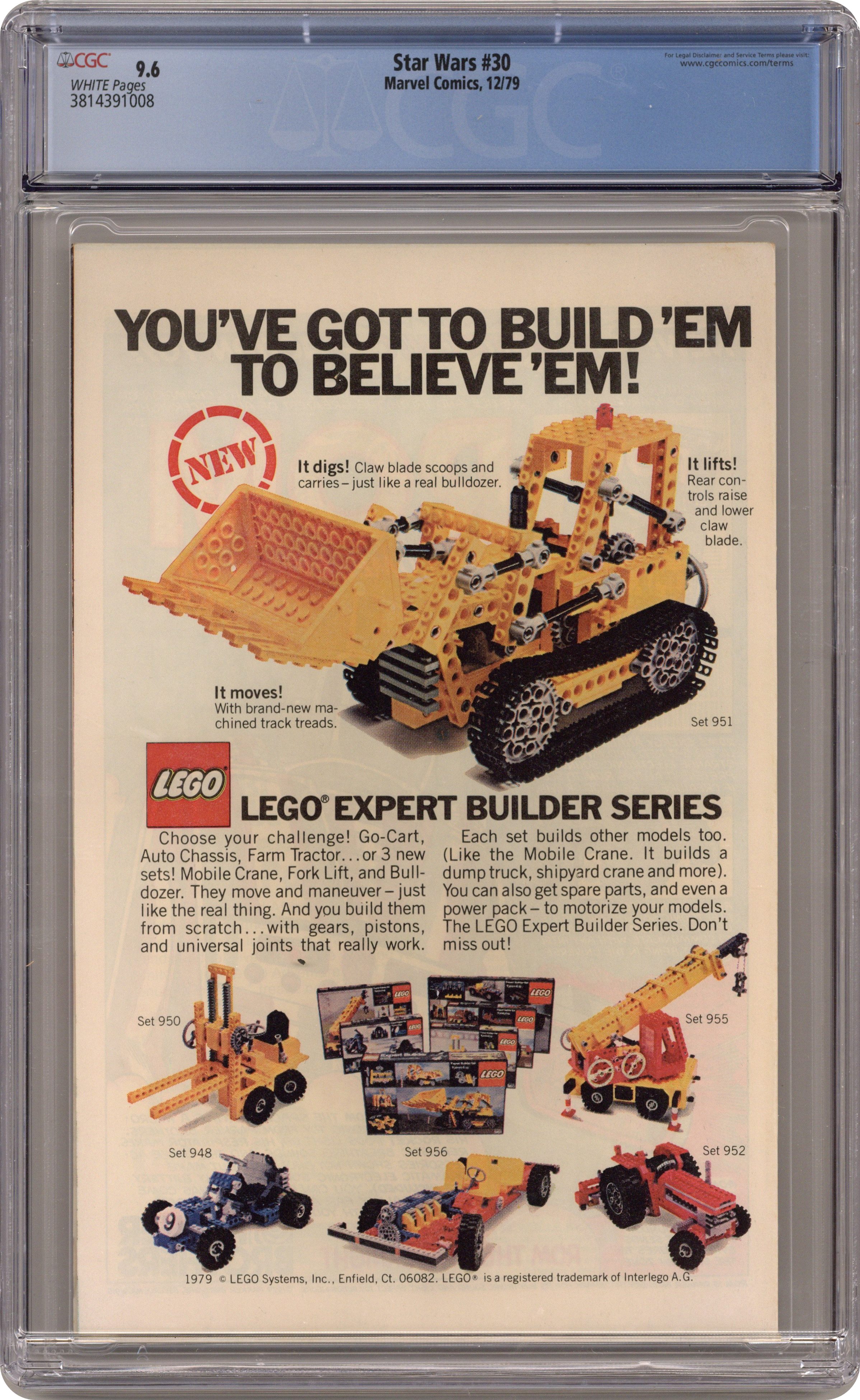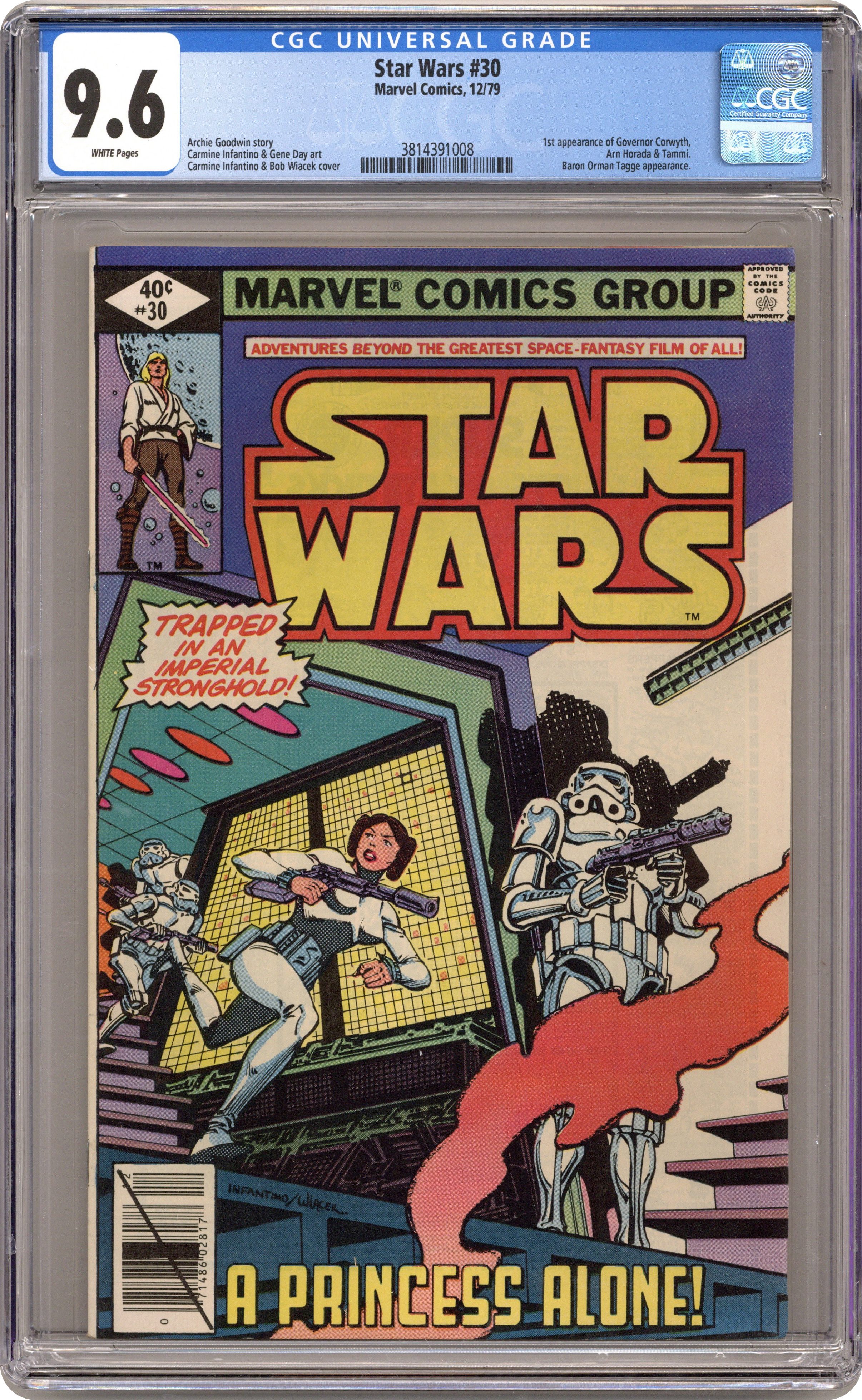 Direct Edition. "A Princess Alone!" Written by Archie Goodwin. Art by Carmine Infantino and Gene Day. Trapped within an Imperial stronghold, the beautiful and brave Princess Leia must use her wits to escape certain death. Includes a 1-page ad for the Rom the Spaceknight action figure, the toy that inspired the comic series by the same name. Cover price $0.40. Grade: CGC 9.6 explanation of grade Condition: Used (collectible)