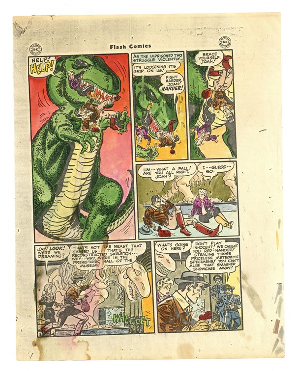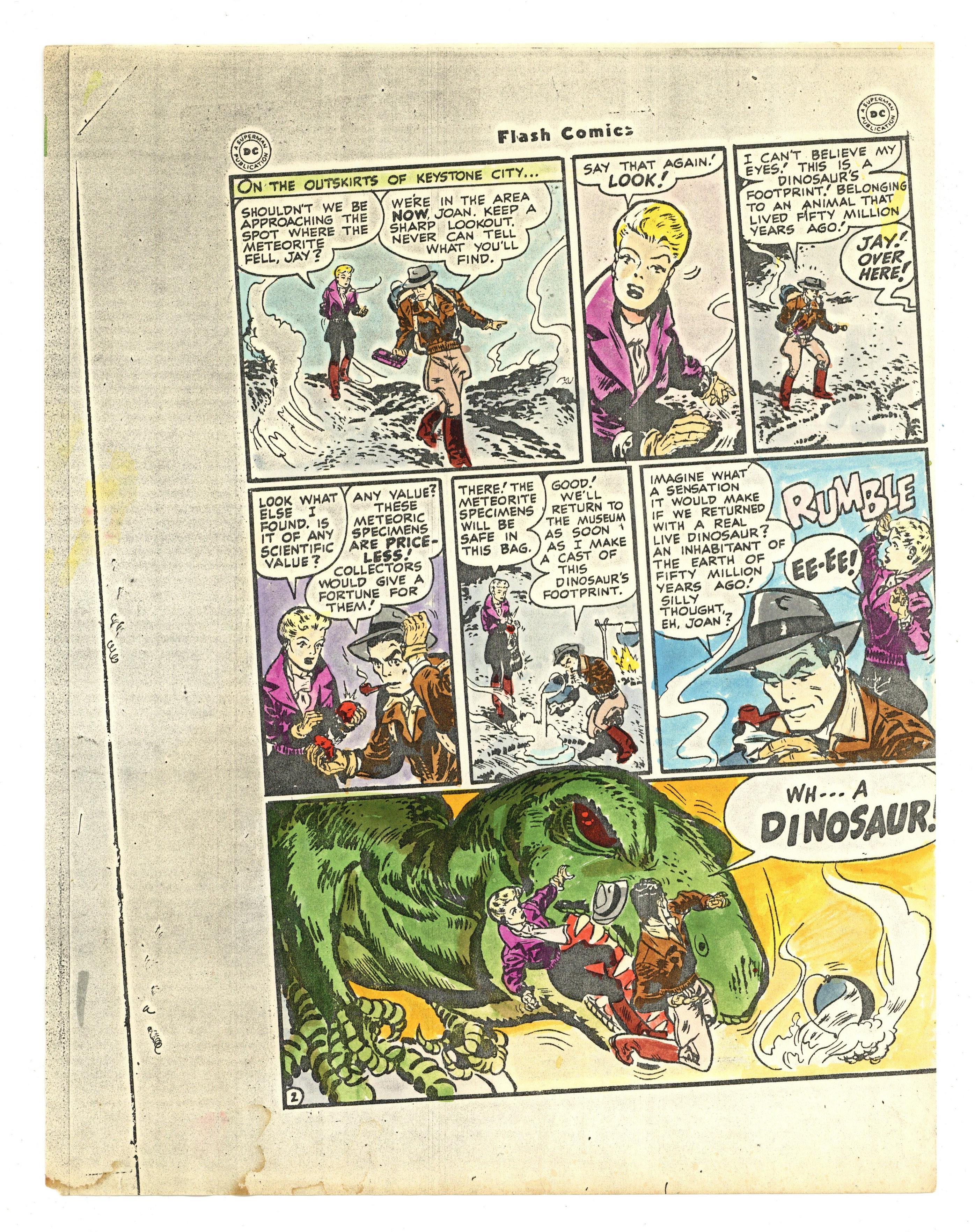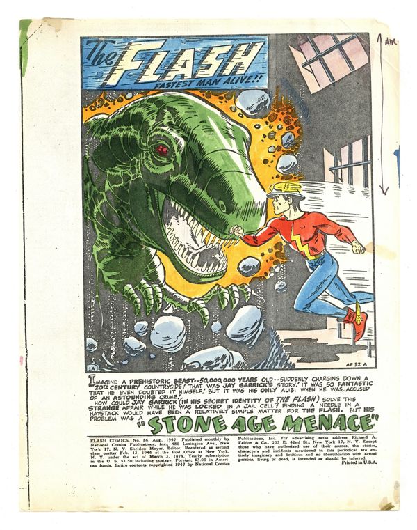 Original Color Guides for the Reprint of Flash Comics (1940) #86 from The Greatest Flash Stories Ever Told (1991) by Greg Theakston. Hand colored guides on paper for the complete 13-page story "Stone Age Menace". 8 1/2" x 11", full color.