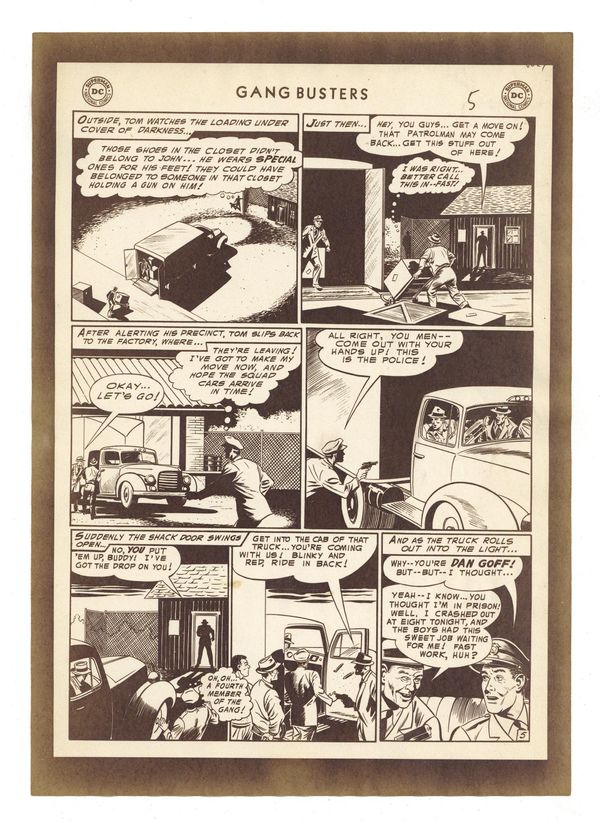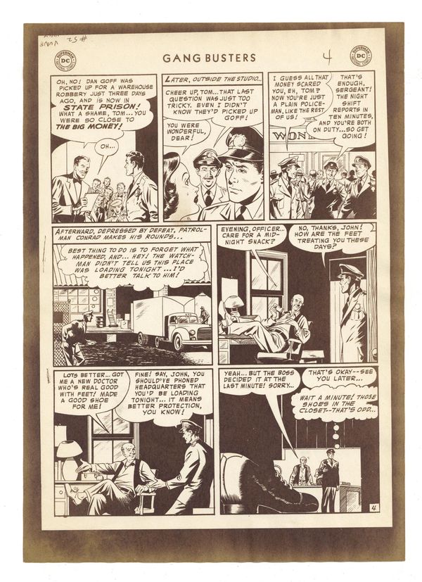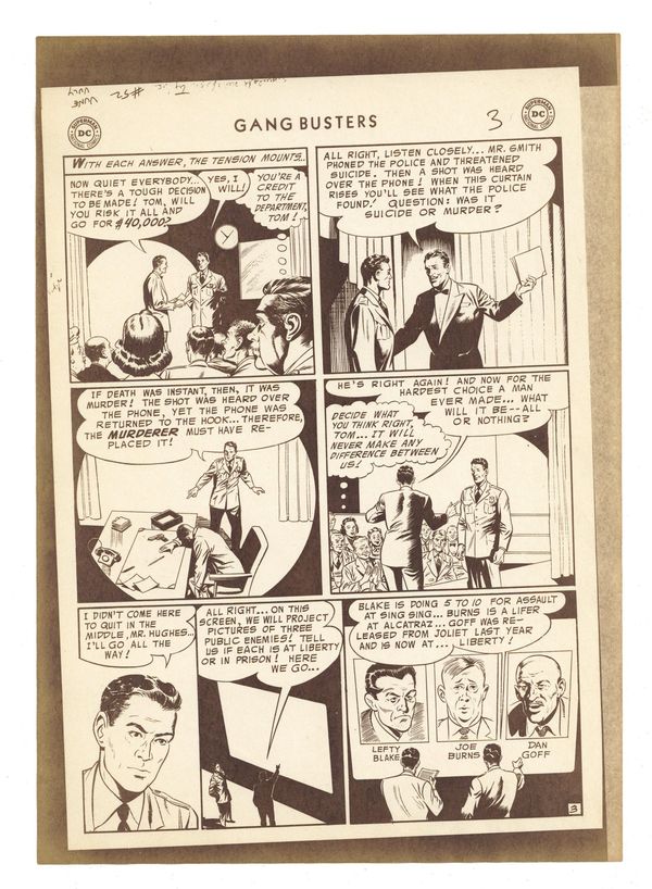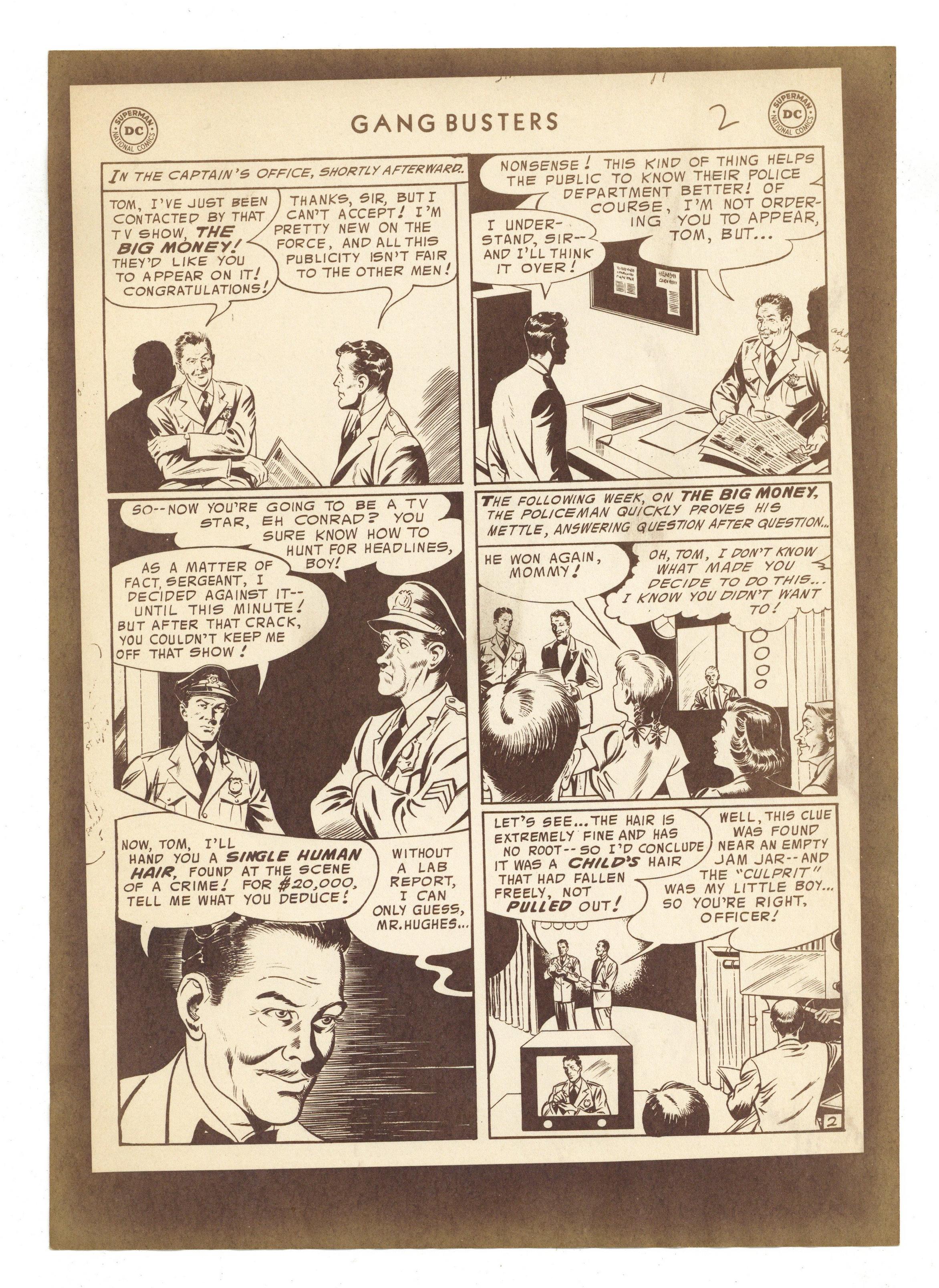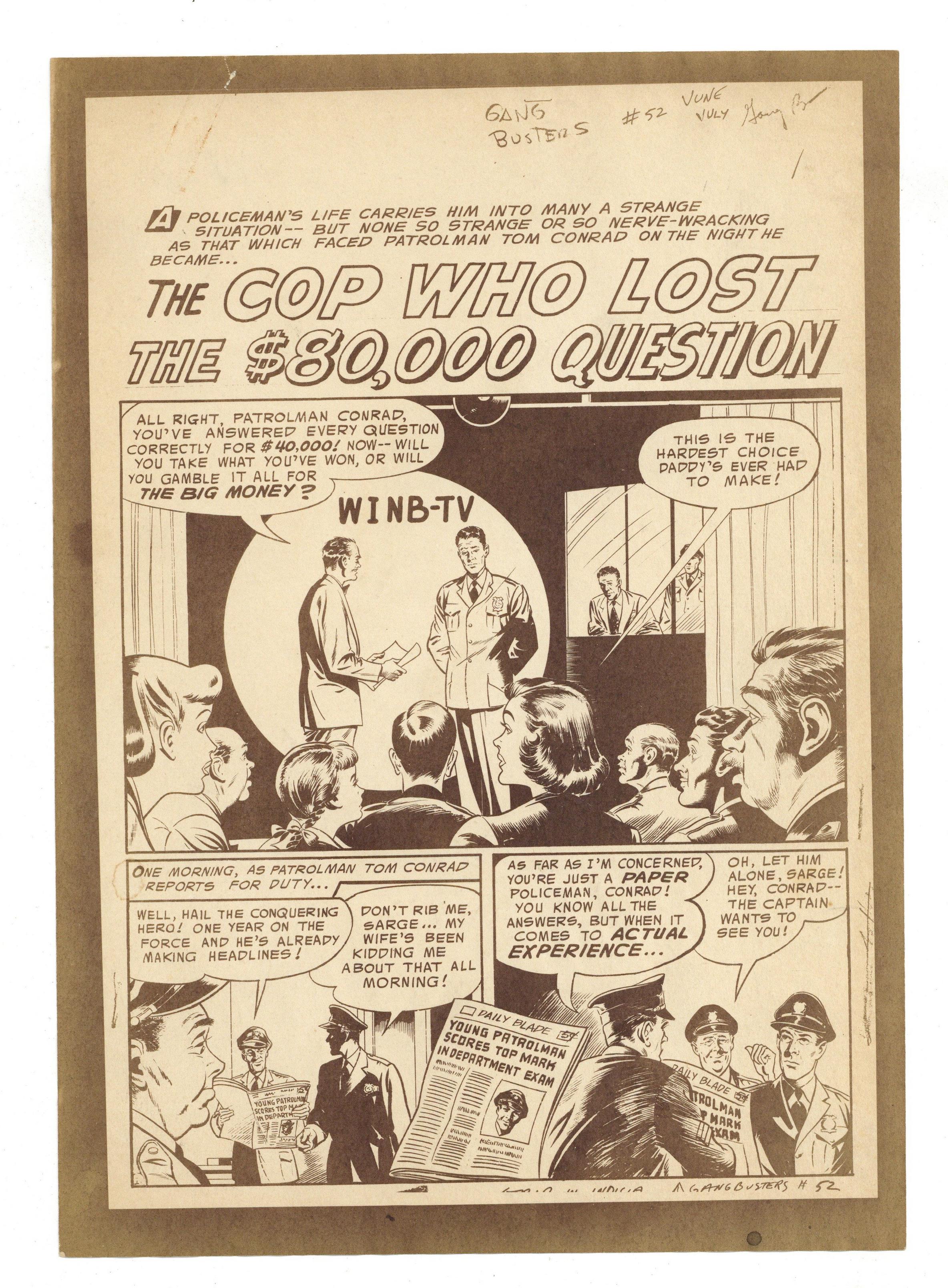 Production Proof for "The Cop Who Lost the $80,000 Question" from Gangbusters (1948) #52. Proofs for the six page story on paper. 7 1/8" x 10", B&W.