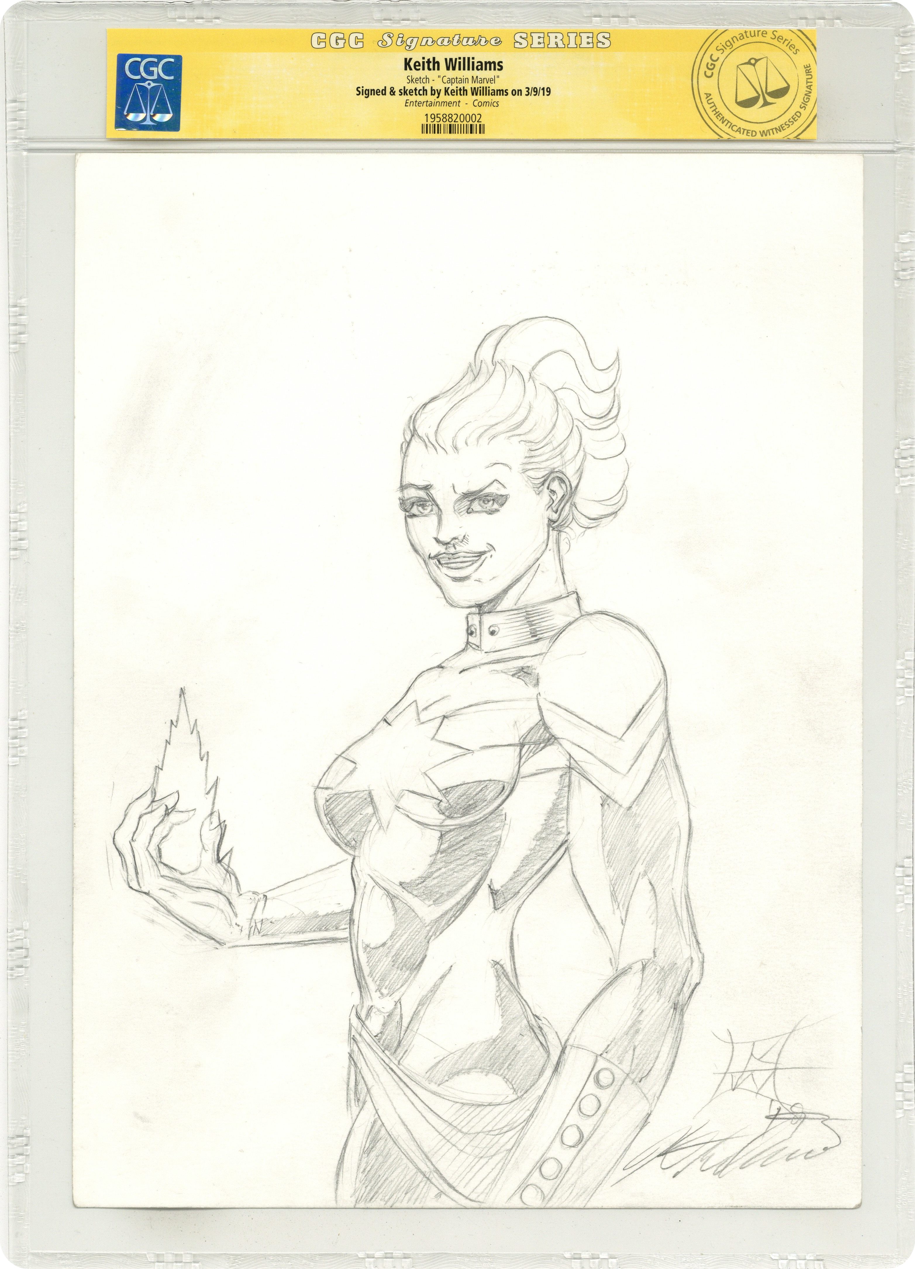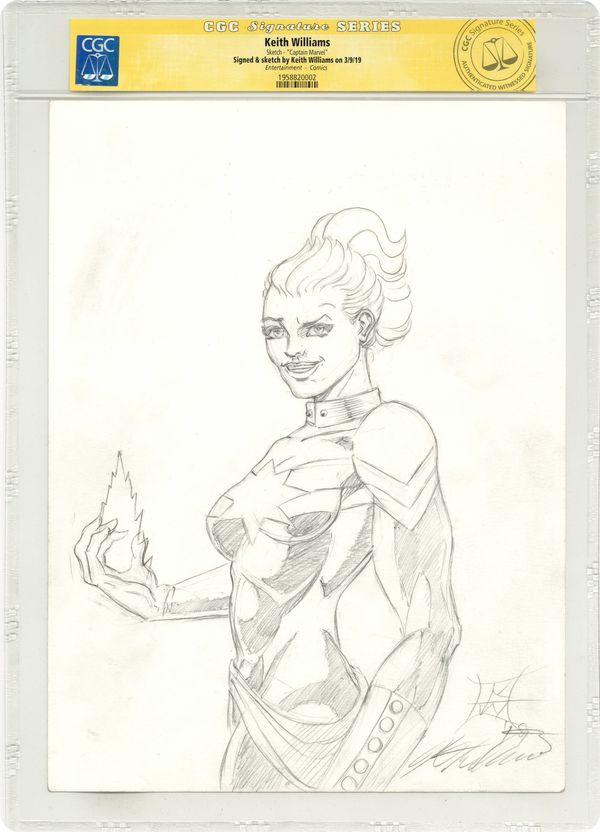 Captain Marvel Sketch by Keith Williams (CGC Signature Series). Signed and sketched by Keith Williams on 3/09/19. Pencil on heavy stock. Art measures 9" x 12", sleeve measures 10 1/2" x 14 1/2".
