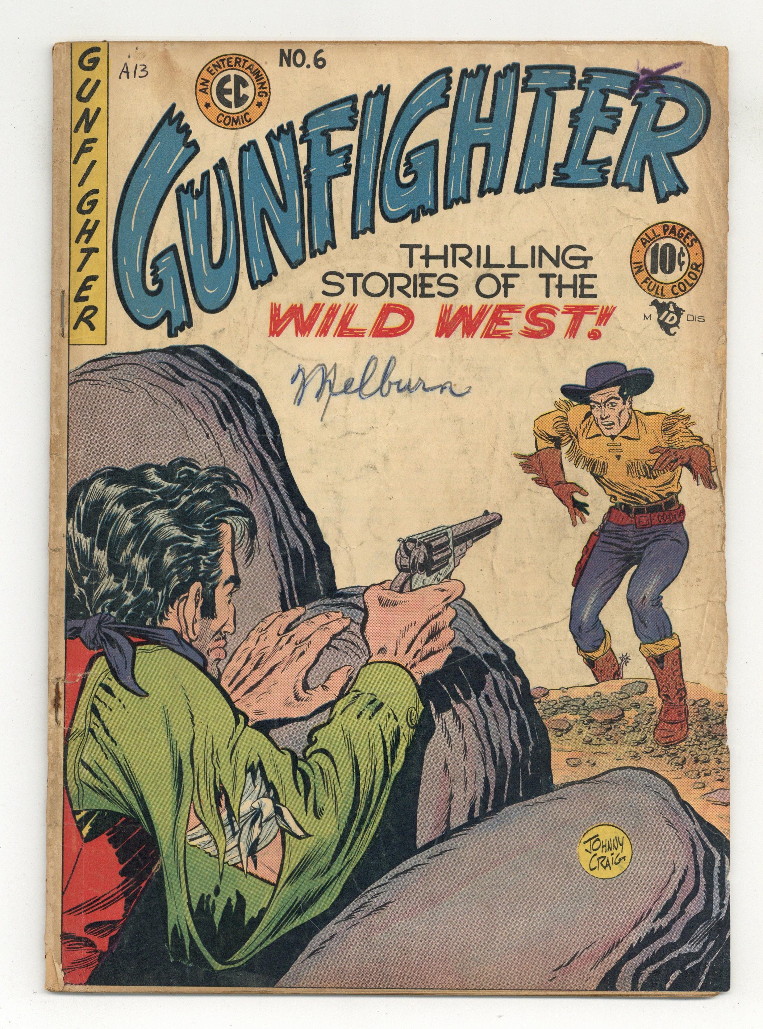Cover by Johnny Craig. Stories by Gardner Fox and others. Art by Graham Ingels, Sheldon Moldoff and Henry Kiefer. This Pre-Trend title from EC Comics featured the adventures of Gunfighter and The Buckskin Kid. A serial killer stalks a Western town, in an early story by "Ghastly" Graham Ingels, warming up for his work on EC's later classic horror comics. Moon Girl enters The Cave of the 1000 Winds. Cover features early art by EC legend Johnny Craig. The Sandyville Slasher!; The Medicine Man of Buffalo Flats!; Ill Go Out in Smoke An Fire!; A Tooth For a Tooth; Moon Girl: The Cave of the 1000 Winds. 36 pages, full color. Cover price $0.10. Grade: GD- 1.8 explanation of grade Condition: Used (collectible)