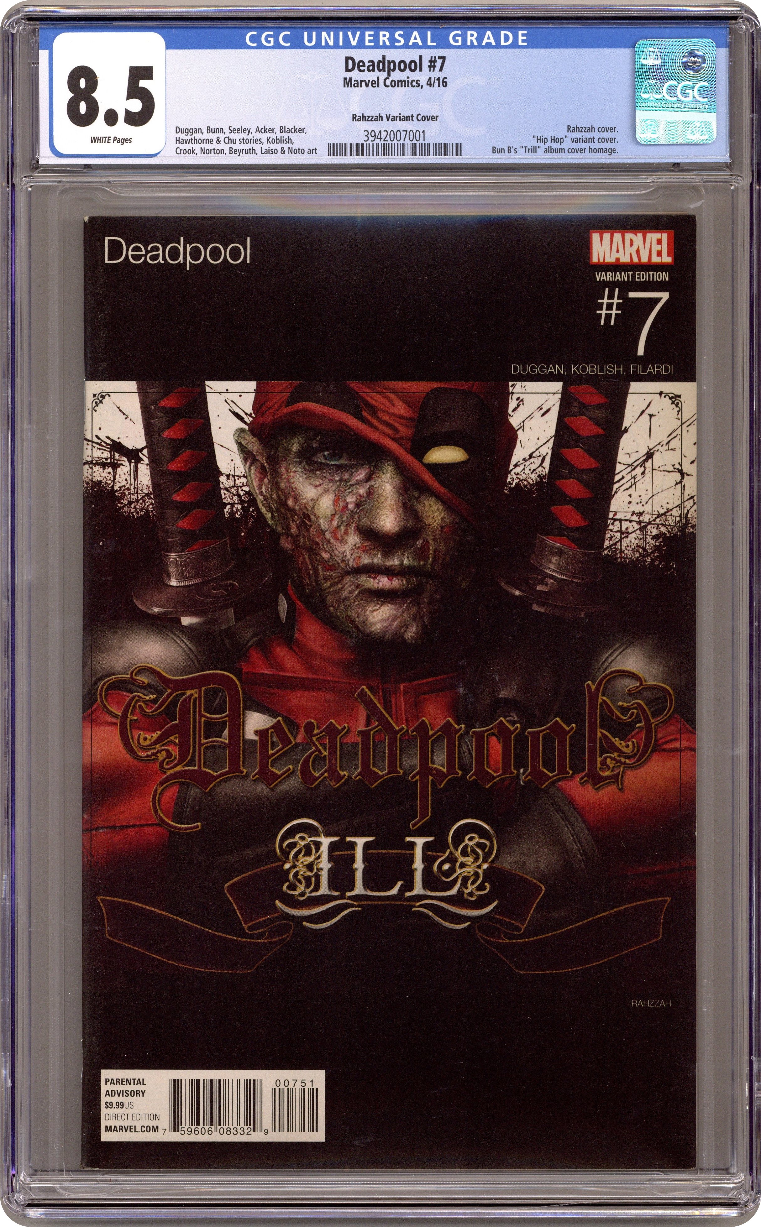 Hip Hop Variant Cover by Rahzzah. Written by Gerry Duggan, Cullen Bunn, Tim Seeley, Ben Acker & Ben Blacker, Mike Hawthorne and Amy Chu. Art by Scott Koblish, Tyler Cook, Mike Norton, Danilo Beyruth, Mike Hawthorne, Emilio Laiso and Phil Noto. Twenty-five years ago in February 1991, the New Mutants encountered a blabber mouthed mercenary who tore through Xavier's mansion and into the very heart of the 1990s. Now, that self-same degenerate is one of the most popular heroes in the world, an Avenger, and maybe the smelliest and grossest person that tumblr swoons over. Come see how Deadpool reacts to life at the top of the world...(hint: he does not handle it well). PLUS: A full array of stories from Deadpool's new allies, the members of the Mercs for Money! Oh...and I think there is, like...some other Deadpool thing this month people are excited about? I forget what. 92 pages, full color.Parental Advisory Cover price $9.99. Grade: CGC 8.5 explanation of grade Condition: Used (collectible)