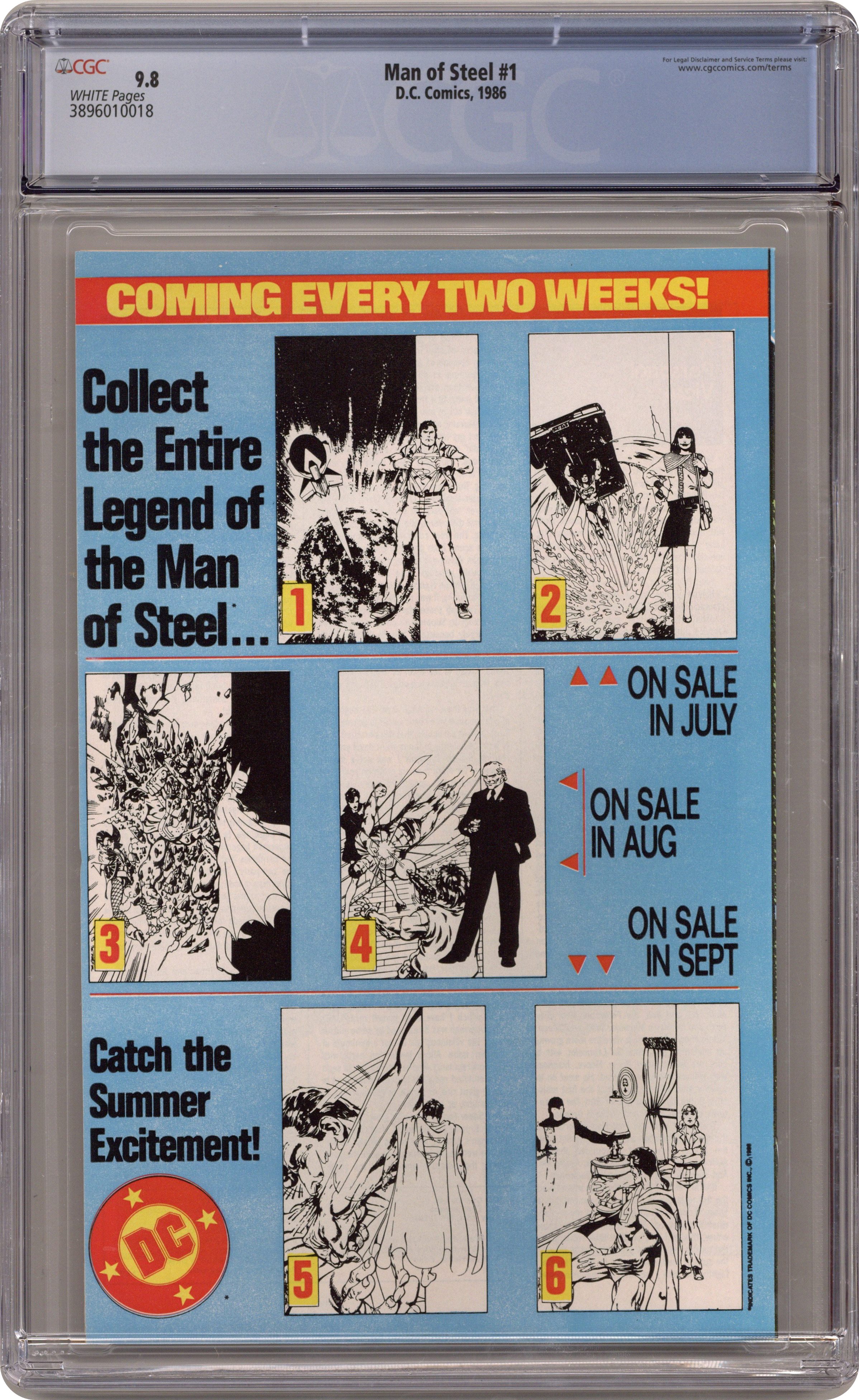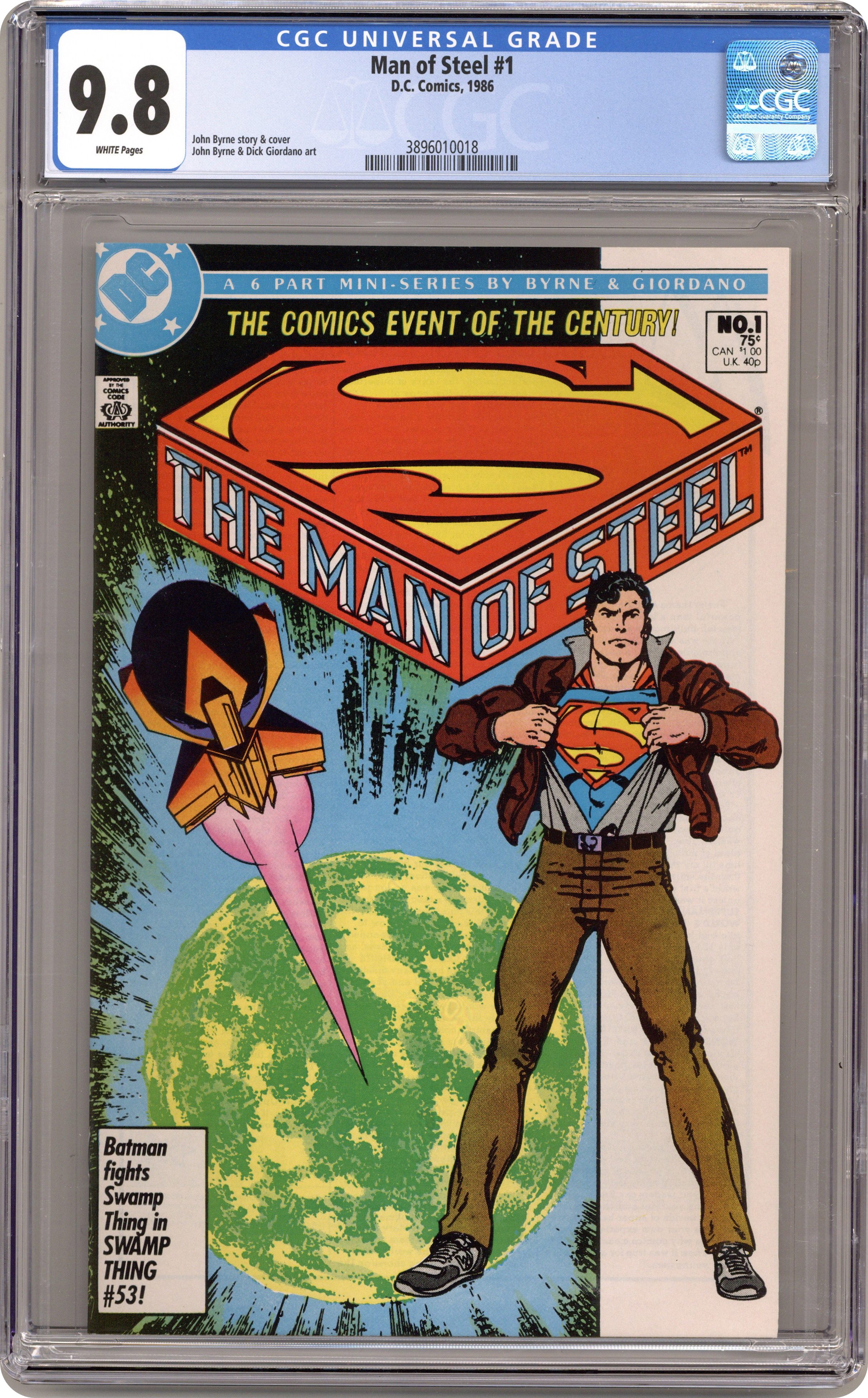 Standard Direct Edition. Published just a few months after Crisis on Infinite Earths, John Byrne's The Man of Steel updated the saga of Superman for modern audiences. His origin was altered, as were many other aspects of the character. This first issue reveals that Kal-El was conceived via the mingling of seeds in a matrix chamber, Clark's powers developed slowly over time (meaning Superboy was written out of continuity), and Superman's body projected an aura that protected his now vulnerable costume. Written and drawn by John Byrne, with inks by Dick Giordano. Cover price $0.75. Grade: CGC 9.8 explanation of grade Condition: Used (collectible)