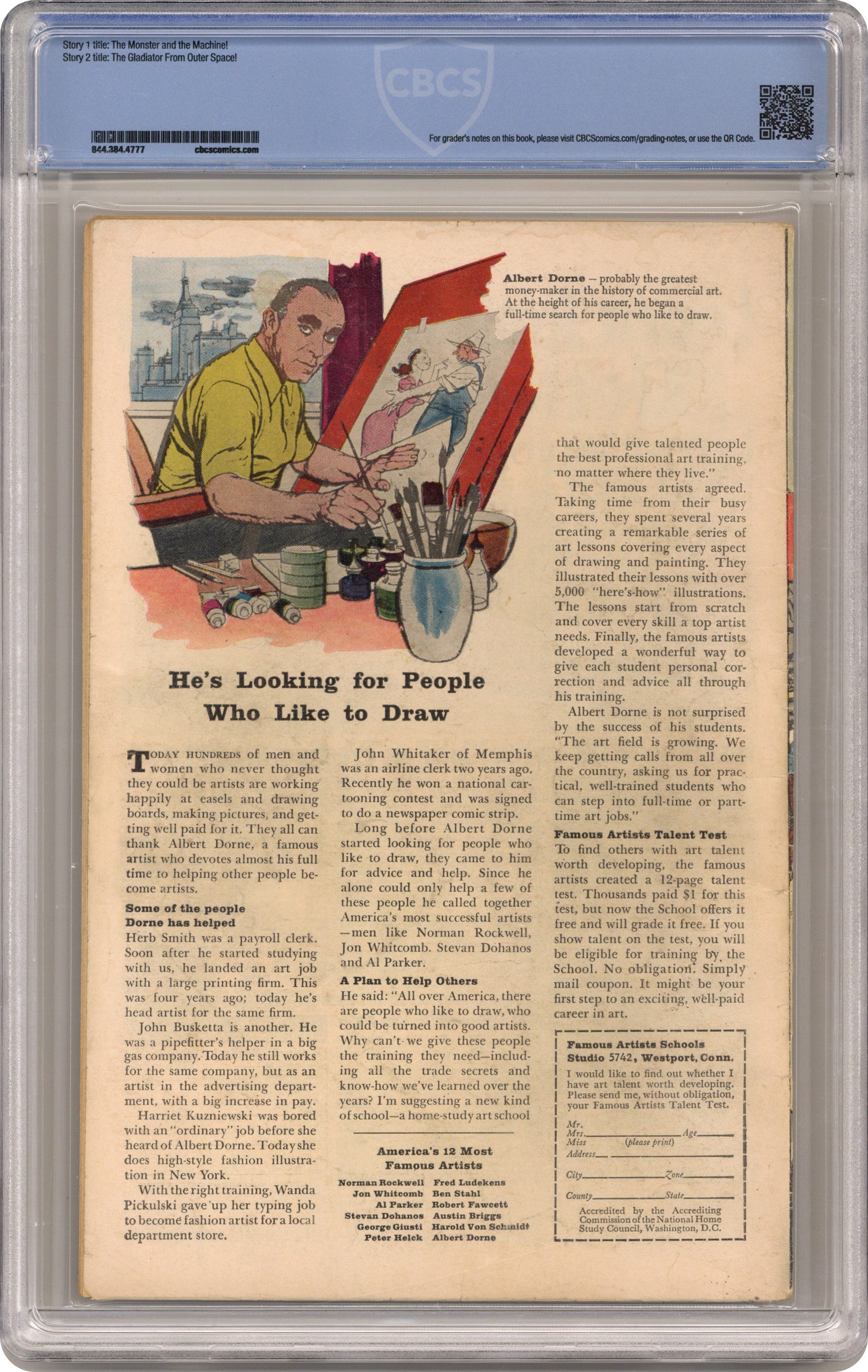 Ended Jul 27 2022 Winning Bid $551 Cover pencils by Jack Kirby, inks by Dick Ayers. "The Monster and the Machine!," script by Stan Lee, pencils by Jack Kirby, inks by Dick Ayers; Rick uses some of Banner's machinery to transform the Hulk, who was stuck in his monster persona, back into Bruce. "The Gladiator from Outer Space!," script by Stan Lee, pencils by Jack Kirby, inks by Dick Ayers; An alien invades Earth and claims his people will conquer the planet unless he is met in battle by the strongest opponent the world has to offer; Hulk meets the challenge but finds out it is all a ploy by the Russians to capture him and create an army of hulks of their own. 36 pgs., full color. $0.12. Cover price $0.12. Grade: CBCS 3.0 explanation of grade Condition: Used (collectible)