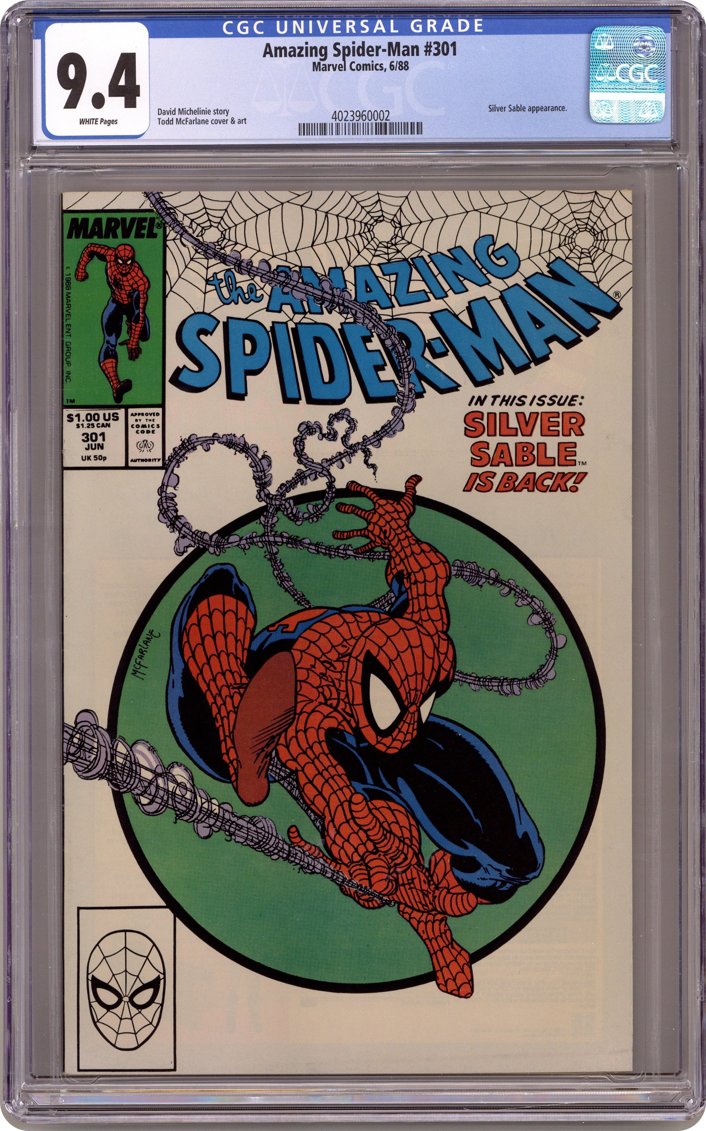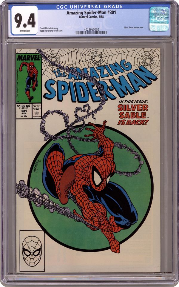Ended May 23 2022 Winning Bid $180 Direct Edition. "The Sable Gauntlet!" Guest-starring Silver Sable. Script by David Michelinie. Art by Todd McFarlane. Cover by Todd McFarlane. The first 300 issues of the Amazing Spider-Man are in the books after the web-slinger's epic battle vs. Venom last issue! And now the next chapter in the wall-crawler's anthology begins with an encounter with his favorite mercenary: Silver Sable! The enchanting sable agrees to make a test run through the security systems of a new high-rise office building, but deadly danger awaits on the top floor! Will Spidey catch the elevator in time? Cameo appearances by Mary Jane Watson and Dr. Morris Sloan. First $1.00 issue. (Notes: The cover is the same artwork (with different colors) as the cover to issue 300. This issue includes a full-page ad for the first appearance of Typhoid Mary in the Daredevil (1st) series -- art by John Romita Jr. and Al Williamson. The letters page contains a statement of ownership: average print run 469,913; average paid circulation 284,692. 36 pgs. Cover price $1.00. Grade: CGC 9.4 explanation of grade Condition: Used (collectible)