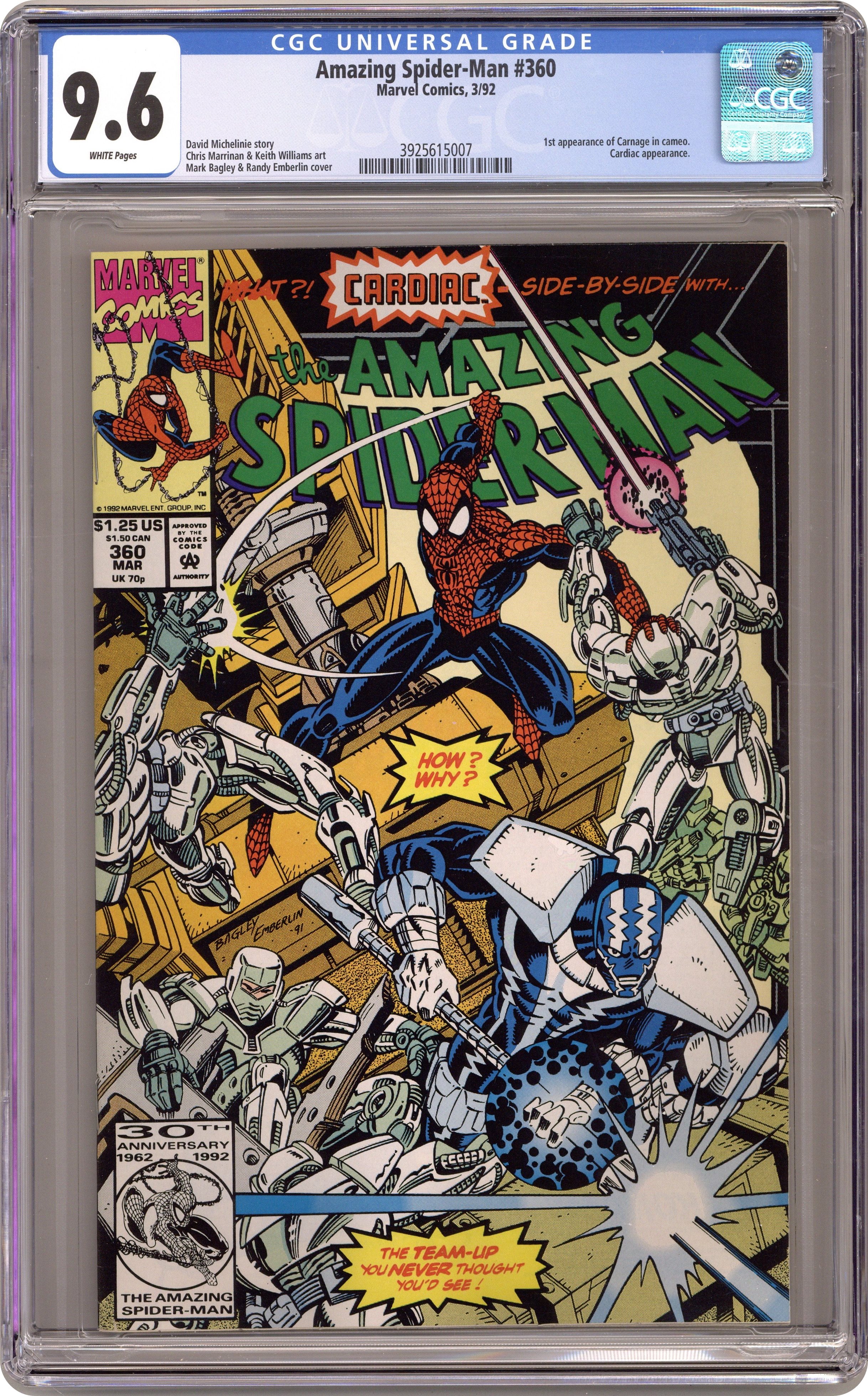 Direct Edition. "Death Toy!" Part 2 of 2. Script by David Michelinie. Pencils by Chris Marrinan. Mark Bagley. Inks by Keith Williams. Cover by Mark Bagley and Randy Emberlin. At the Tech-Toy warehouse, Cardiac and the wall-crawler come to a meeting of the minds about their pursuits of justice! Perhaps it's possible for them to work together after all! The next evening at Stane International, Spider-Man and Cardiac team up to stop the illegal manufacturing of military weapons! Could this be the beginning of a beautiful friendship? Not quite! Meanwhile, a new blood-hued super-villain makes his first savage kill...the first of many! Cameo appearances by Carnage, Mary Jane Watson, Ben Urich, Joy Mercado, and J. Jonah Jameson. Origin of Cardiac. (Notes: Cardiac returns in Amazing Spider-Man 376. The letters page contains a statement of ownership: average print run 470,075; average paid circulation 340,977.) 36 pages. $1.25 cover price. Cover price $1.25. Grade: CGC 9.6 explanation of grade Condition: Used (collectible)