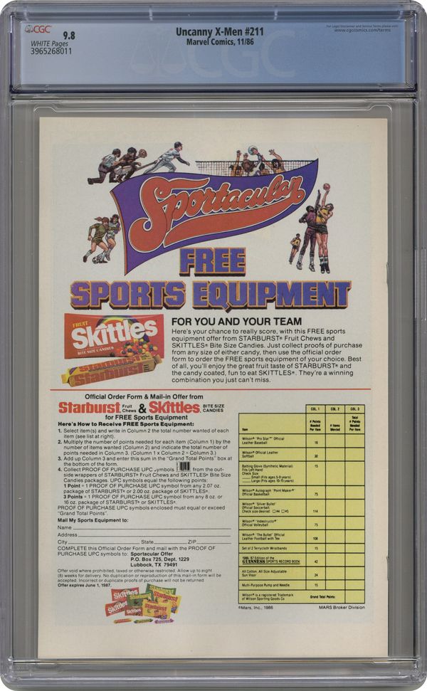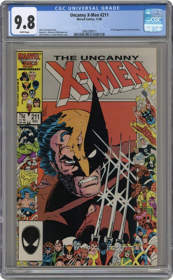 Direct Edition. Marvel 25th Anniversary Cover - Mutant Massacre tie-in - "Massacre!" Story by Chris Claremont. Art by John Romita, Jr., Bret Blevins, and Al Williamson This issue continues one of the darkest chapters in mutant history. A mercenary force called the Marauders attempts to commit genocide on the outcast Morlocks, and the only thing standing in their way is the X-Men and X-Factor. This is a storyline that has repercussions on the X-titles for years to come. When the X-Men finally catch up to the murderous villains one of the costliest battles in X-Men history follows. It's a battle that will leave several members of the team severely injured. Story continues in New Mutants #46 and Power Pack #27. NOTE: Includes the Mutant Massacre Map, a key to following the events in this pivotal storyline. 36 pgs. Cover price $0.75. Grade: CGC 9.8 explanation of grade Condition: Used (collectible)