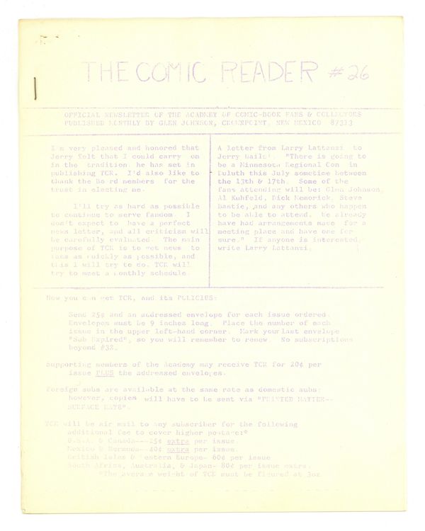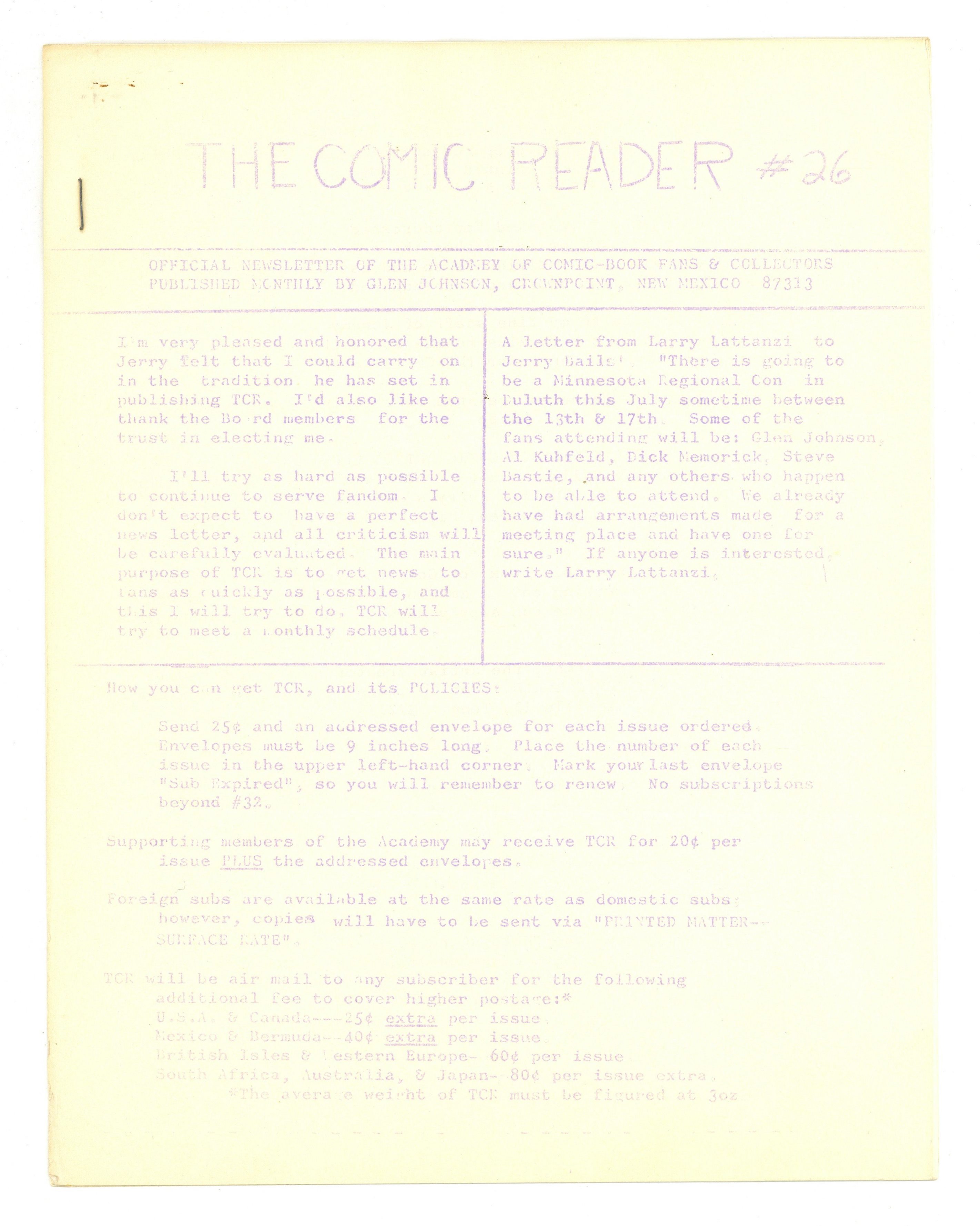 Issue #26 - June 1964. New editor Glen Johnson takes over the Comic Reader. Report of a visit to Russ Manning's house, the latest comic news, a Chicago showing of the complete Captain America serial, a small Detroit convention report by Jerry Bails, fanzine reviews by Jeremy Barry. 8 1/2-in. x 11-in., 12 pages, B&W. Grade: VF- 7.5 explanation of grade Condition: Used (collectible)