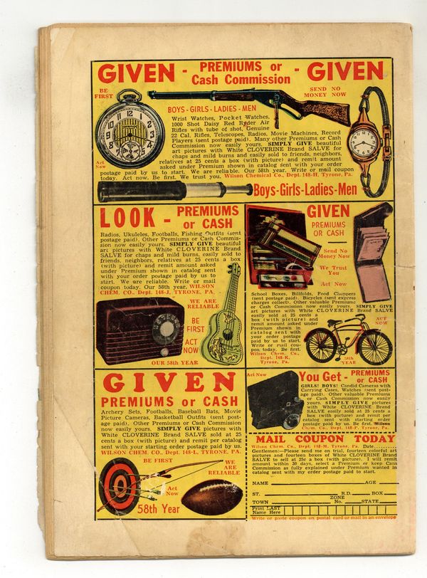 Help Wanted!, art by Mort Lawrence; A cheap department store owner's toy demonstrator quits after receiving a Christmas bonus of only one dime, and so the owner attempts to save money by shortening the help wanted ad to "Demon. Wanted." Curse of the Mummy text story. Swamp Girl!, art by Vic Carabotta; A deserter becomes a werecat when he drinks water from the bayou. They Dive by Night!, art by Al Luster; A native warns a pearl diver not to dive by night so as to have enough light to see where to avoid the man-eating clams, but he doesn't listen. Fast Freight; A man escapes from prison and manages to hop onto a passing train, not knowing that the train is carrying freight right back to the prison. Bong!, art by Tony DiPreta; A man resolves to murder his rival for the affections of a beautiful girl, but ends up killing himself by falling into the bell-maker's molten vat. 36 pages, full color. Cover price $0.10. Grade: GD 2.0 explanation of grade Condition: Used (collectible)