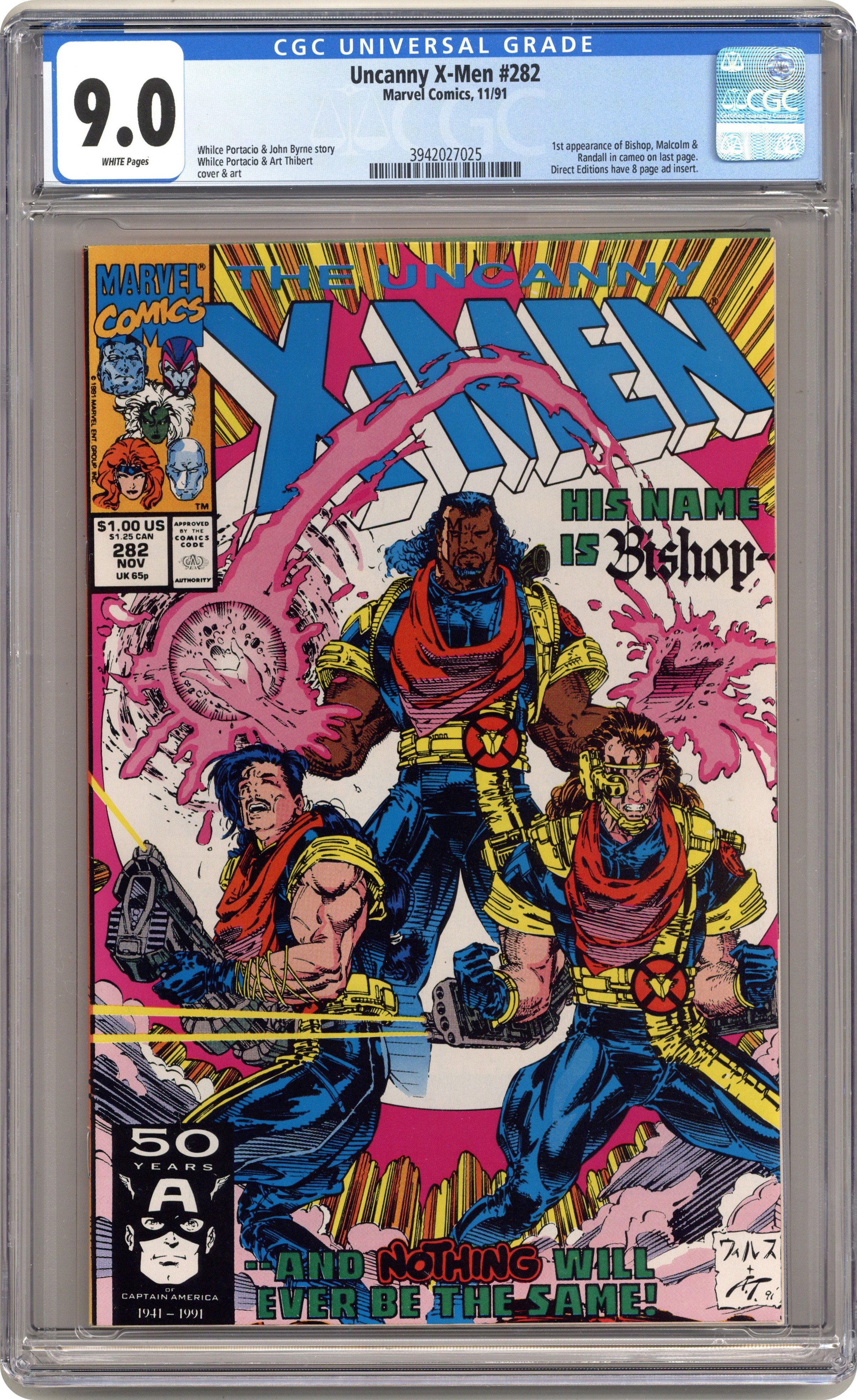 Direct Edition. "Payback!" Story by Whilce Portacio and John Byrne. Art by Whilce Portacio and Art Thibert. In one fell swoop the Upstarts have destroyed the Reavers and crippled the Hellfire Club. Next up, the Mutant Liberation Front. Who can stop these powerful new foes? Enter: Bishop! NOTE: 1st appearance of Bishop. 40 pgs. Cover price $1.00. Grade: CGC 9.0 explanation of grade Condition: Used (collectible)