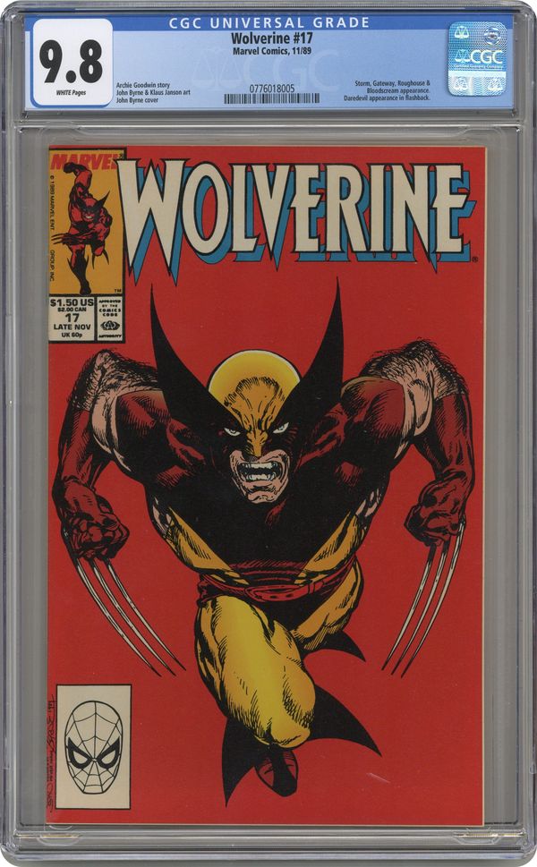Direct Edition. Part 1 of 7 - "Basics!" Daredevil cameo. Written by Archie Goodwin. Art by John Byrne and Klaus Janson. There's a new crime boss in town, the cyborg Geist. This mysterious new villain has brought with him a lethal new kind of cocaine and he has captured Wolverine's erstwhile sparring partner Roughhouse in order to test it. 32 pages, FC Cover price $1.50. Grade: CGC 9.8 explanation of grade Condition: Used (collectible)