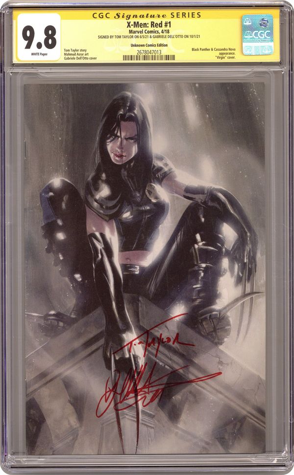 Unknown Comics variant by Gabrielle Dell'Otto. The Hate Machine: Part 1 - Written by Tom Taylor. Art by Mahmud A. Asrar. - THE FIRST SENSATIONAL ARC OF AN ALL-NEW TEAM OF X-MEN STARTS HERE! JEAN GREY is back! Returned to a world she doesn't recognize, the First Lady of the X-MEN gathers an unlikely team - NIGHTCRAWLER, NAMOR and LAURA KINNEY (A.K.A. ALL-NEW WOLVERINE) - to face an evil that threatens to tear down XAVIER's dream by any means necessary! 36 pages, full color. Rated T+ Cover price $4.99. Grade: CGC 9.8 explanation of grade Condition: Used (collectible)