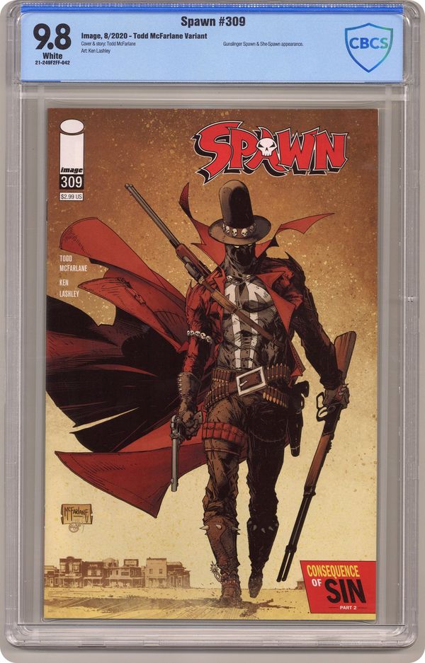 Consequence of Sin: Part 2 - Written by Todd McFarlane. Art by Ken Lashley. Cover by Todd McFarlane. New heroes! New villains! New war! The MYSTERIOUS and DANGEROUS army of Spawns continues to grow. First She-Spawn and Reaper! Then Medieval Spawn! Now Gunslinger Spawn has made his presence known. But who is a hero and who is a villain? And is Al Simmons strong enough to control them all? Maybe his new armor will help! TODD McFARLANE and KEN LASHLEY continue their epic tale! 28 pages, full color. Cover price $2.99. Grade: CBCS 9.8 explanation of grade Condition: Used (collectible)