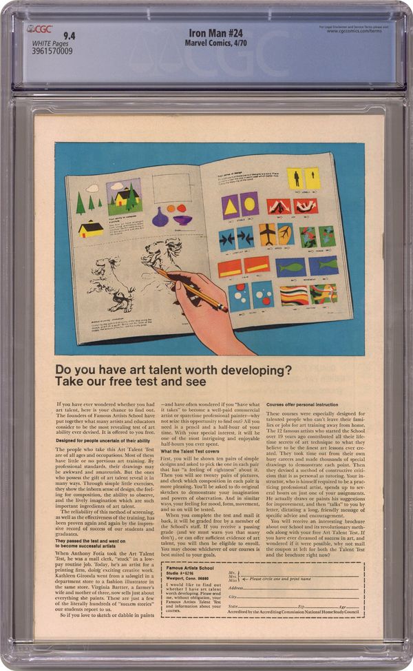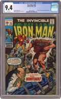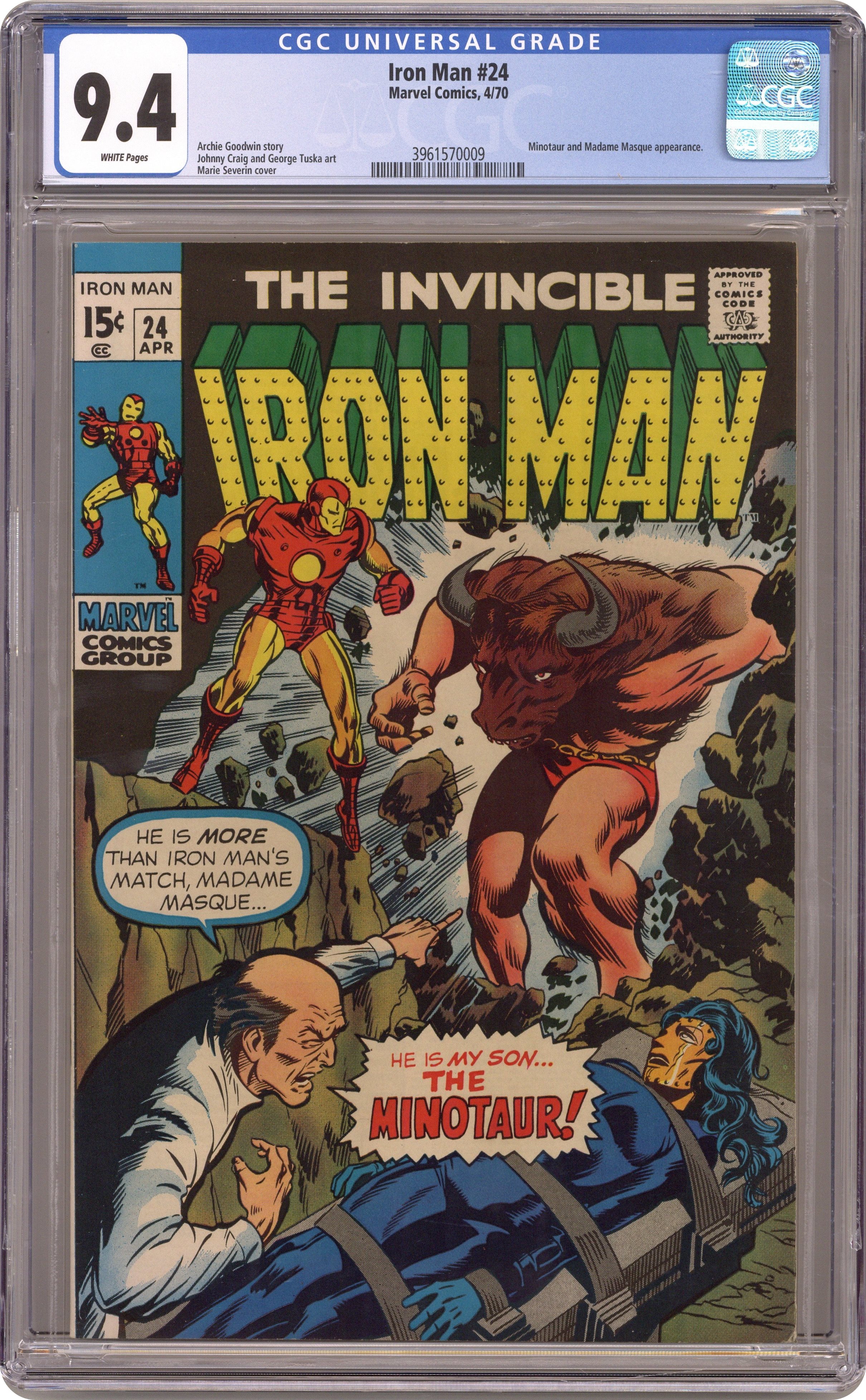 "My Son...The Minotaur!" Story by Archie Goodwin. Art by Johnny Craig and George Tuska. Cover by Marie Severin. Following the events of Iron Man 19, Madame Masque (aka Whitney Frost) washed up in a grotto on an Aegean Sea island. Now she is the unsuspecting prisoner of the twisted Dr. Vryolak and the Minotaur! The duo of Iron Man and Jasper Sitwell is on the way to free her, but can they rescue Madame Masque before Dr. Vryolak turns her into a mate for his son? 32 pages Cover price $0.15. Grade: CGC 9.4 explanation of grade Condition: Used (collectible)