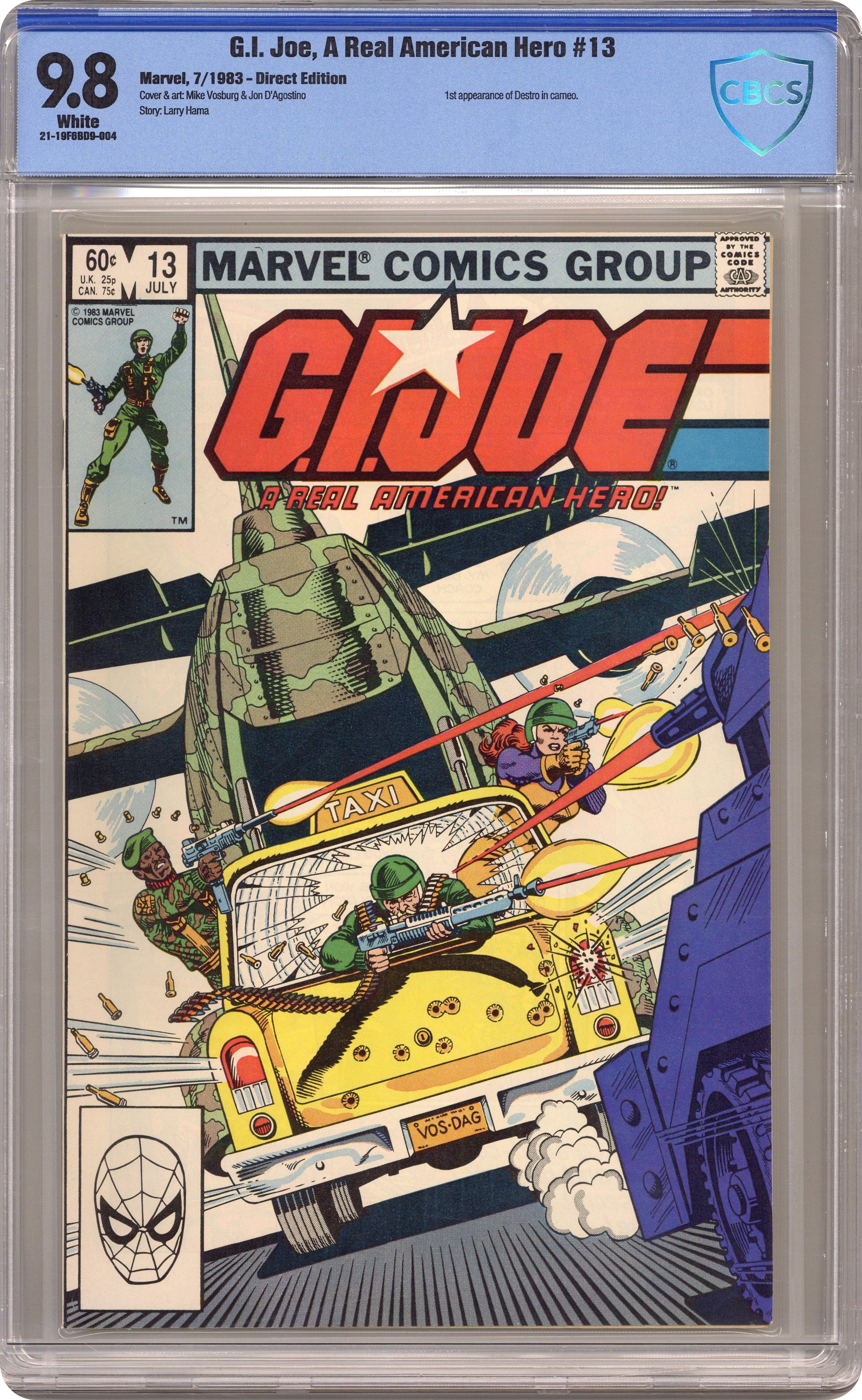 1st printing - "Last Plane from Rio Lindo!" Written by Larry Hama. Art by Mike Vosburg and Jon D'agostino. Scarlett and Hawk lead the Joes on a mission to South America to rescue Snake-Eyes, Stalker, Gung-Ho, and Breaker, but just where is Snake-Eyes? Destro seen again in shadow only. 1st appearance of Torpedo. 32 pages, FC. Cover price $0.60. Grade: CBCS 9.8 explanation of grade Condition: Used (collectible)