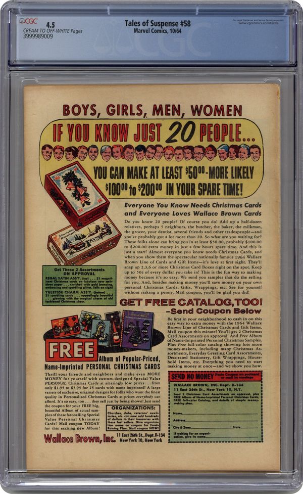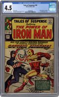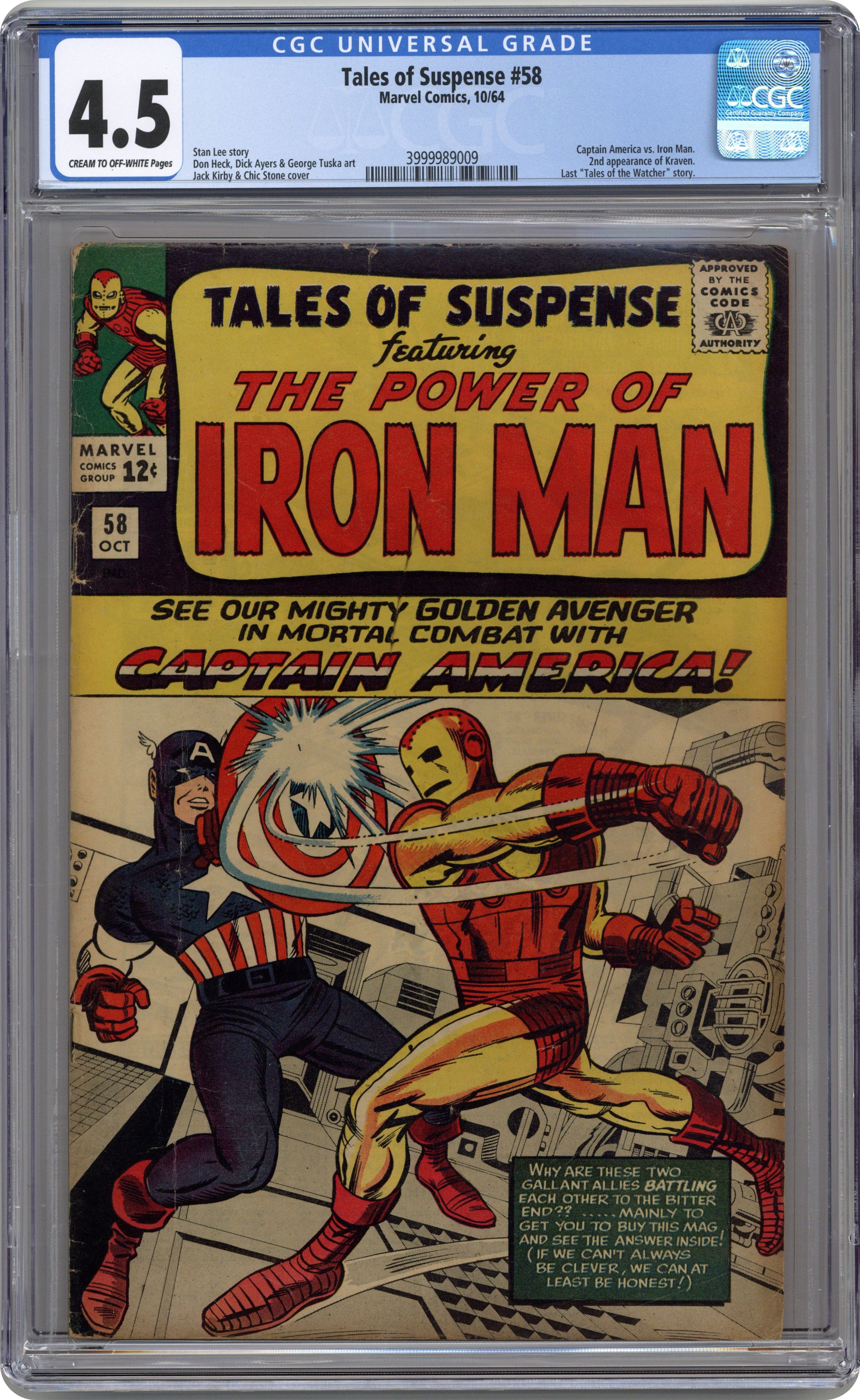 Cover pencils by Jack Kirby, inks by Chic Stone. Captain America (first appearance in this title) battles Iron Man in "In Mortal Combat with Captain America!", script by Stan Lee, pencils by Don Heck and Jack Kirby, inks by Dick Ayers; The Chameleon tricks Iron Man into attacking Captain America, and the two fight until the misunderstanding is discovered; Second Kraven the Hunter appearance; Giant-Man and Wasp appearances. "The Runner!" text story. "The Watcher Must Die!", script by Stan Lee, art by George Tuska; An alien warlord attacks the Watcher, and is instantly destroyed by accelerated aging; This is the last Tales of the Watcher story in Tales of Suspense; Another series starts as a back-up in Silver Surfer (1968 series) #1. 36 pgs., full color. $0.12. Cover price $0.12. Grade: CGC 4.5 explanation of grade Condition: Used (collectible)