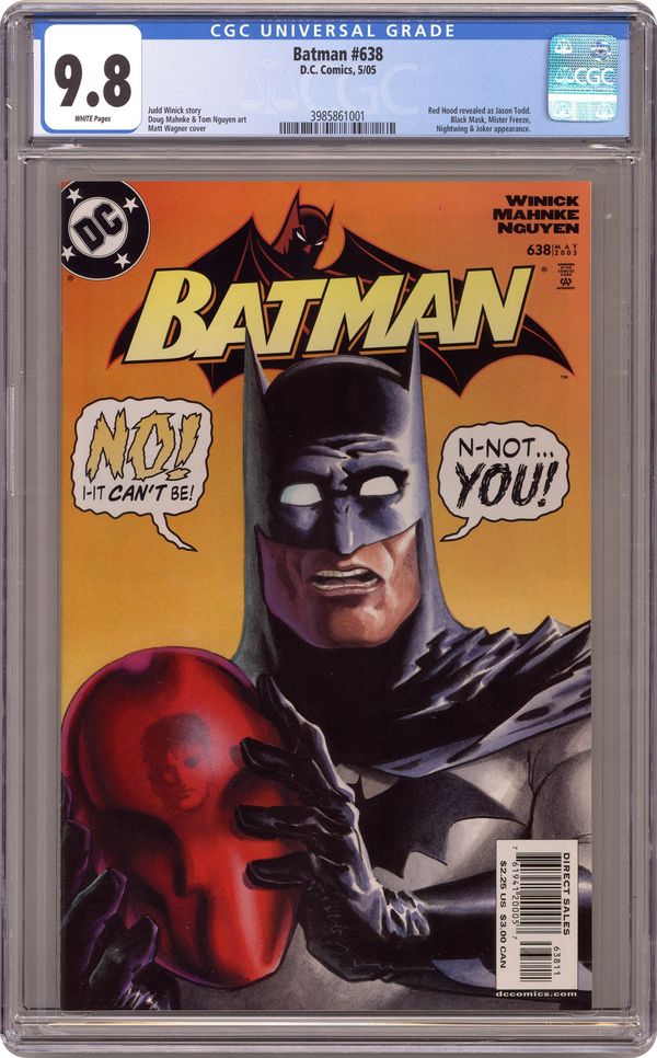 Written by Judd Winick Art by Doug Mahnke & Tom Nguyen Cover by Matt Wagner. In the stunning conclusion of "Under the Hood," the Red Hood is revealed as.....! With the murderous Black Mask controlling the Gotham City underworld, what role will this villainous addition to Batman's Rogues Gallery have when all is said and done? 36 Pages, Full Color. Cover price $2.25. Grade: CGC 9.8 explanation of grade Condition: Used (collectible)
