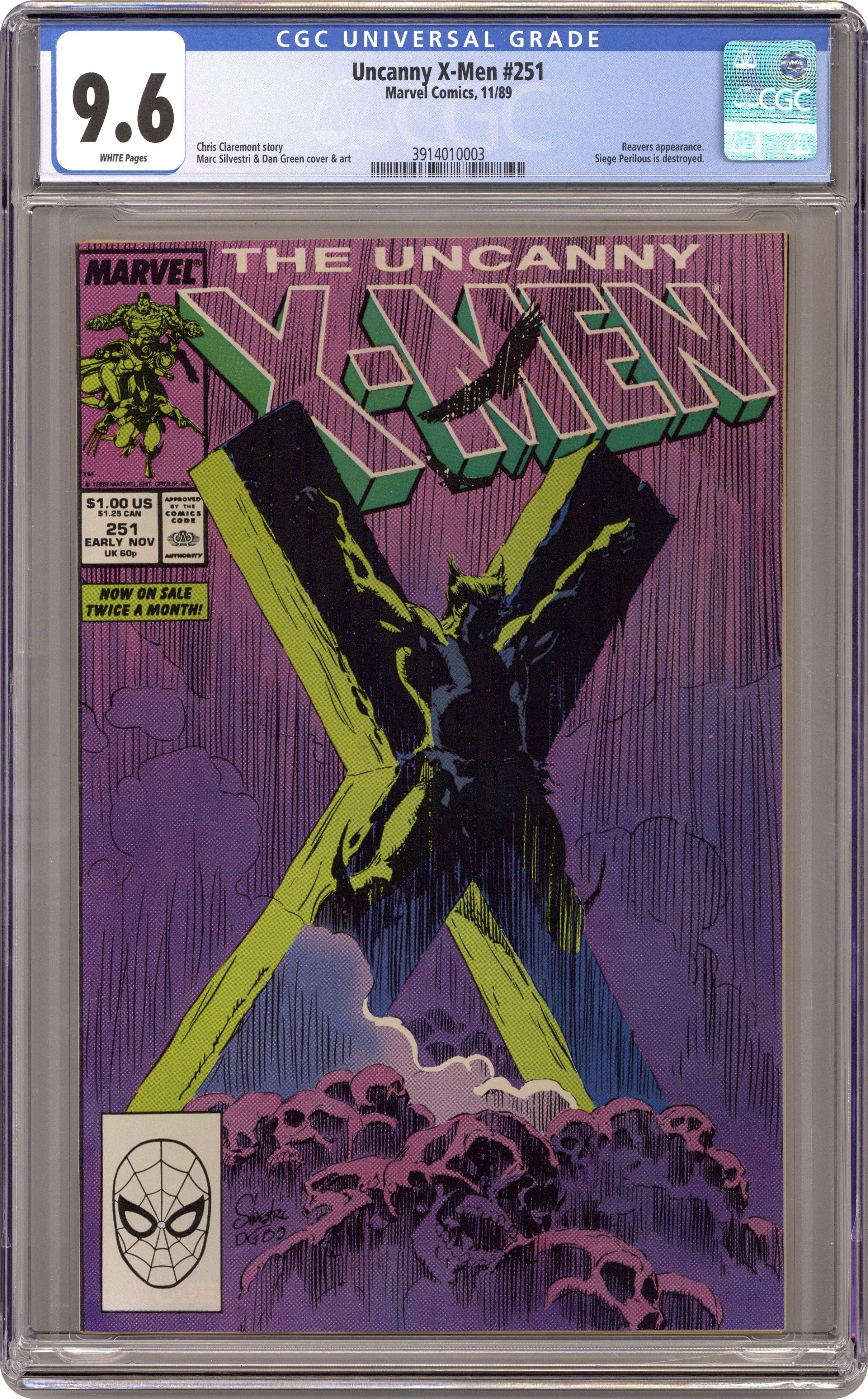 Direct Edition. "Fever Dream!" Part 1 of 2. Story by Chris Claremont. Art and cover by Marc Silvestri and Dan Green. Wolverine is badly wounded and left to the mercies of the diabolical Donald Pierce and his deadly Reavers. But, what happened to the rest of the X-Men? The answer is shocking, to say the least. 36 pgs. Cover price $1.00. Grade: CGC 9.6 explanation of grade Condition: Used (collectible)