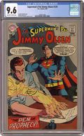 Cover pencils by Curt Swan, inks by Murphy Anderson. Superman versus Ultra-Olsen!, script by E Nelson Bridwell, art by Murphy Anderson; Jimmy becomes Ultra-Olsen, but is blackmailed by two bad guys (who kidnapped his father) into doing robberies for them. The Pen of Prophecy!, script by Leo Dorfman, art by Murphy Anderson; Jimmy gets a pen with magic ink that was supposed used by Edgar Allan Poe and Nostradamus. The Superman Hall of Trophies, script by Otto Binder, pencils by Curt Swan, inks by Ray Burnley. 36 Pages, Full Color. Cover price $0.15. Grade: CGC 9.6 explanation of grade Condition: Used (collectible)