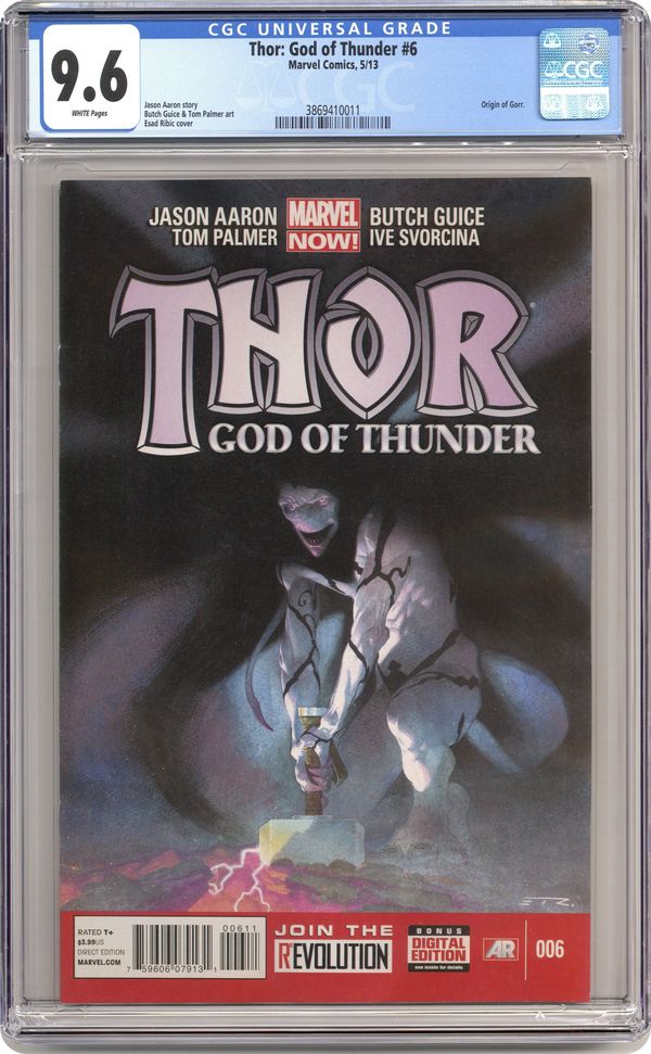 WHAT THE GODS HAVE WROUGHT (W) Jason Aaron. (A) Butch Guice, Tom Palmer. (CA) Esad Ribic. In a chilling interlude, discover the dark origin of Gorr...and the truth behind his bloody quest to butcher the gods. Cover price $3.99. Grade: CGC 9.6 explanation of grade Condition: Used (collectible)