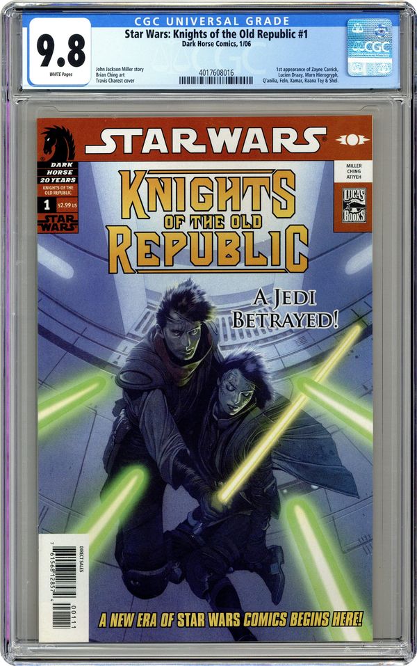 1ST PRINTING. JOHN JACKSON MILLER (W), BRIAN CHING (P), MICHAEL ATIYEH (C), and TRAVIS CHAREST (Cover) FC, 32pg, $2.99. On the planet Taris, a young Padawan named Zayne has been framed for a heinous and brutal crime against the Jedi order. Suddenly a wanted fugitive and on the run from his Jedi Masters, Zayne is forced to ally himself with the under-city's criminals, con artists, and petty thieves he'd previously vowed to bring to justice. Staying alive is the first order of business and if he's ever to clear his name, Zayne must make this new alliance work ... providing he survives the experience. ? To celebrate its twentieth anniversary, Dark Horse is completely relaunching its Star Wars publishing line. This series is the first of many new titles to come. ? A new ongoing monthly series written by John Jackson Miller (Iron Man) and illustrated by Brian Ching (Star Wars Obsession), set four thousand years before the rise of the Empire and the fall of Anakin Skywalker (and eight years prior to the events in the Knights of the Old Republic video game). ? A great starting point for anyone interested in following the Star Wars saga beyond the films. ? Cover by fan-favorite artist Travis Charest (WildC.A.T.S., WildC.A.T.S/X-Men)! Cover price $2.99. Grade: CGC 9.8 explanation of grade Condition: Used (collectible)