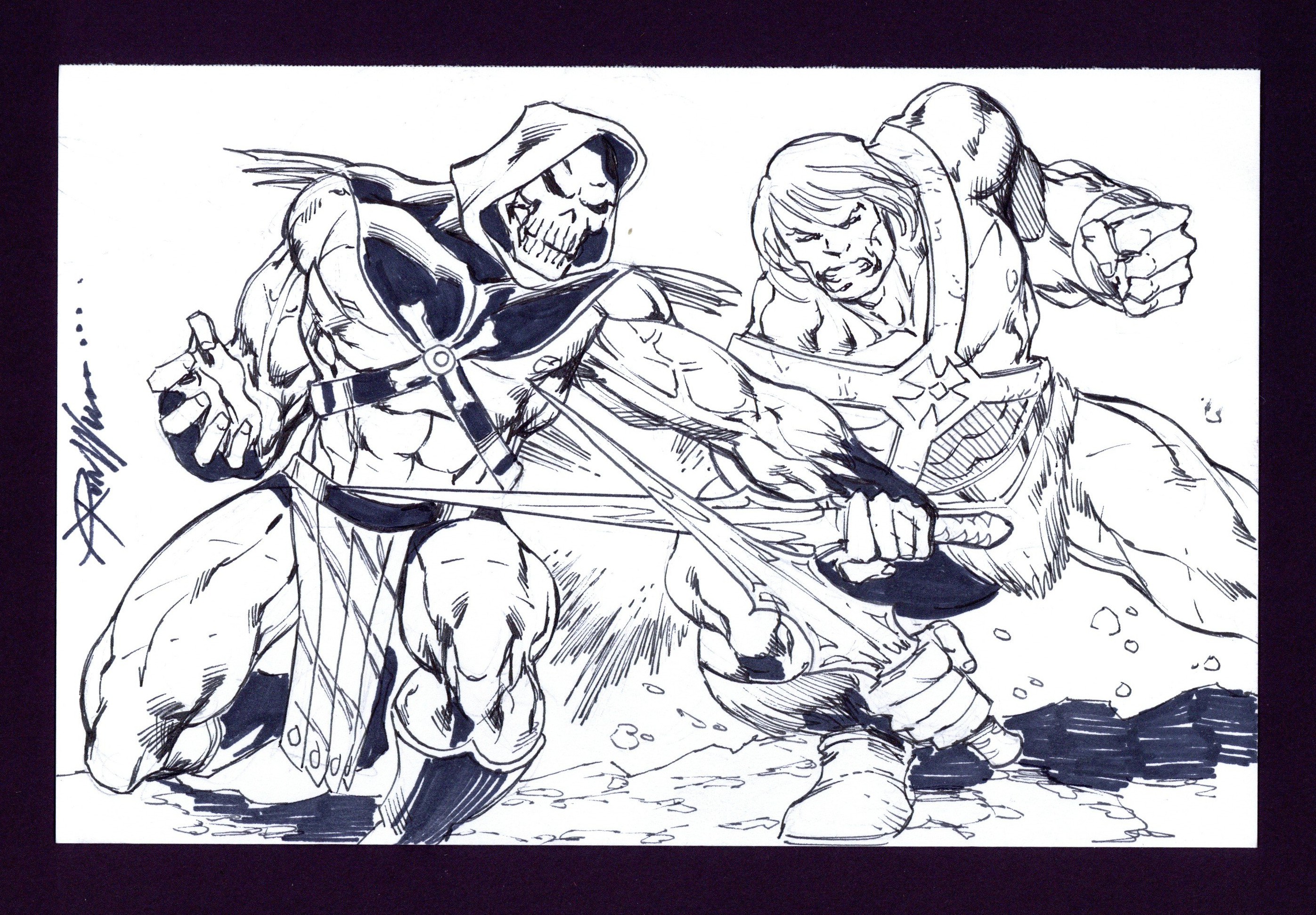 He-Man vs. Skeletor Sketch by Ron Williams. Signed by the artist. Pencil and ink on multimedia paper. 8 1/2" x 5 1/2", B&W.