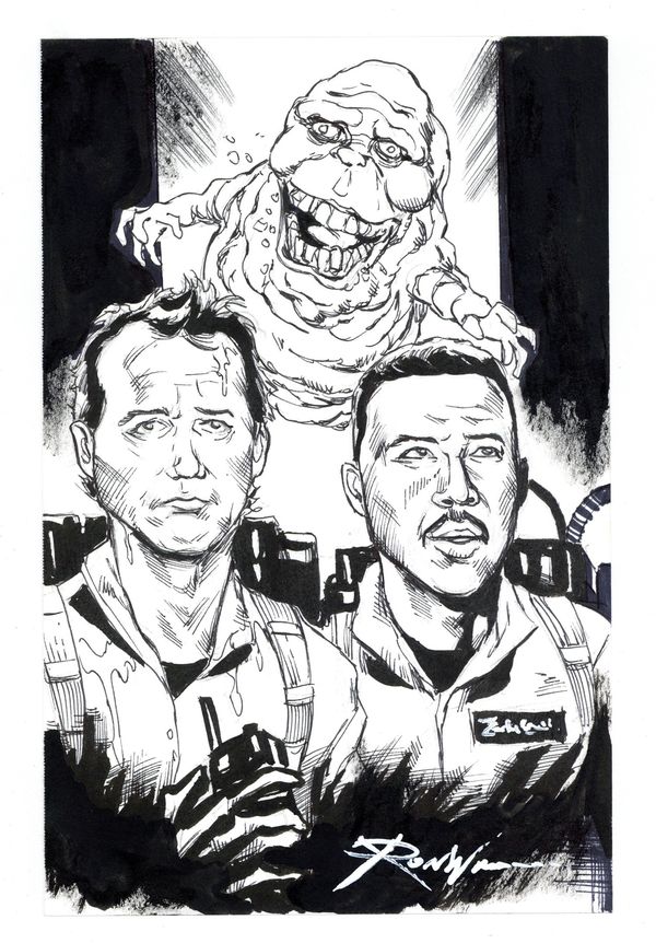 Ghostbusters (Venkman, Winston, and Slimer) Sketch by Ron Williams. Signed by the artist. Pencil and ink on multimedia paper. 8 1/2" x 5 1/2", B&W.