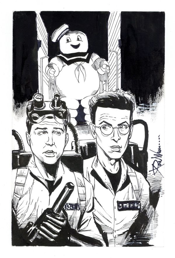 Ghostbusters (Ray, Egon, and Marshmallow Man) Sketch by Ron Williams. Signed by the artist. Pencil and ink on multimedia paper. 8 1/2" x 5 1/2", B&W.