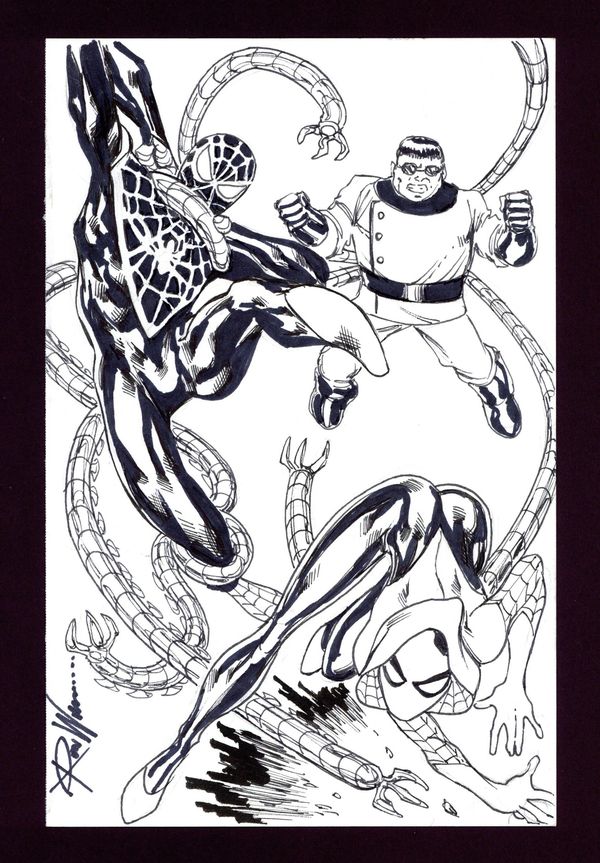 Miles Morales & Spider-Gwen vs. Doctor Octopus Sketch by Ron Williams. Signed by the artist. Pencil and ink on multimedia paper. 8 1/2" x 5 1/2", B&W.