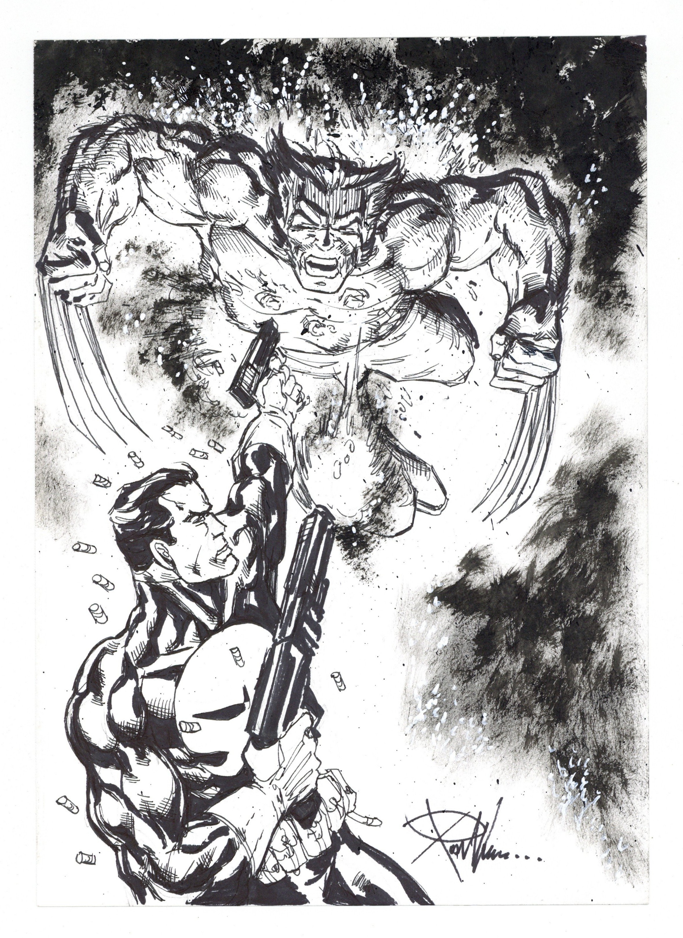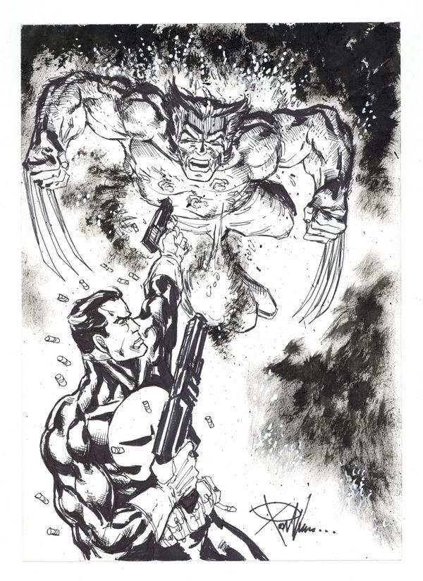 Wolverine vs. Punisher Sketch by Ron Williams. Signed by the artist. Pencil and ink on multimedia paper. 7" x 10", B&W.