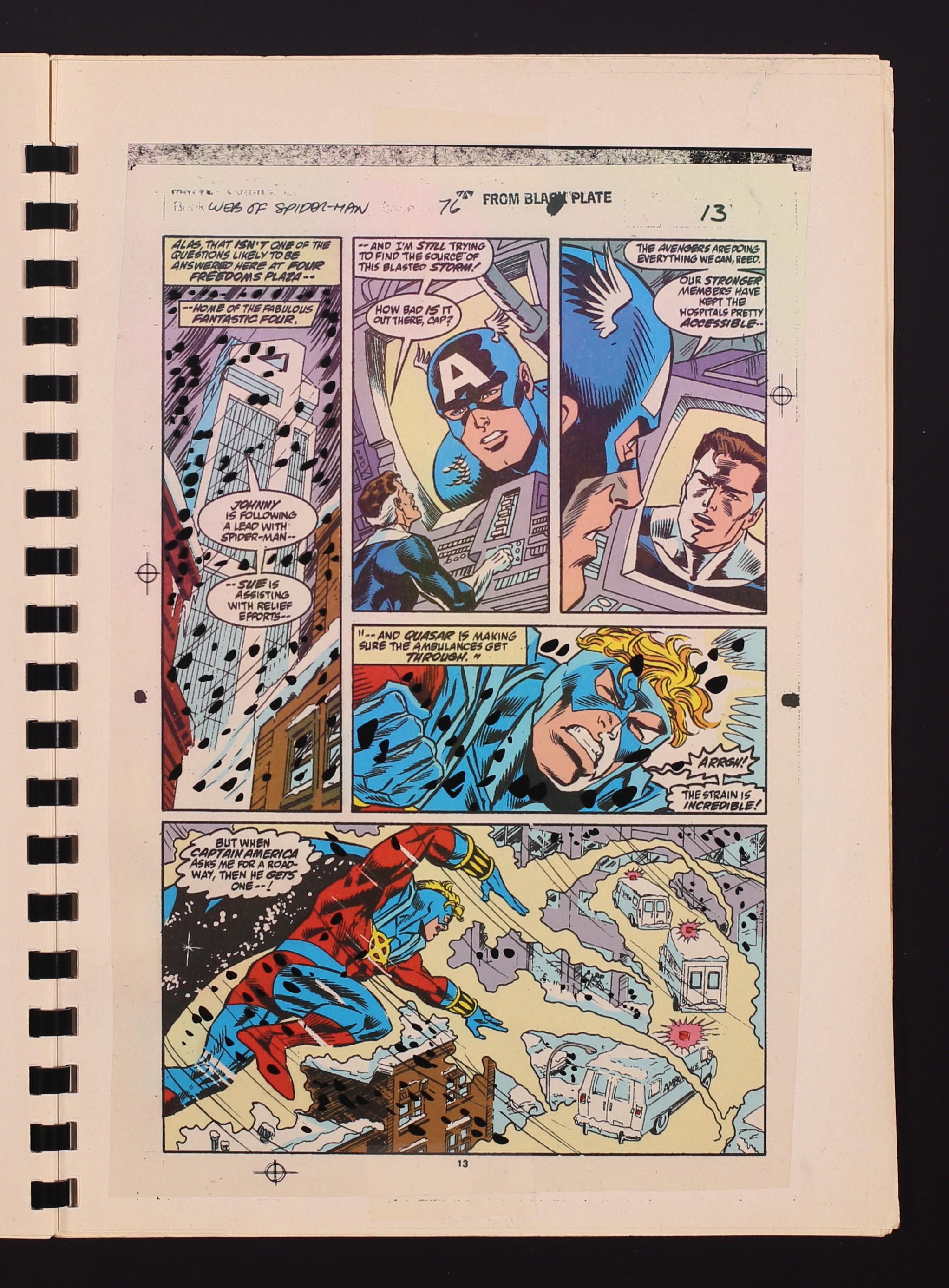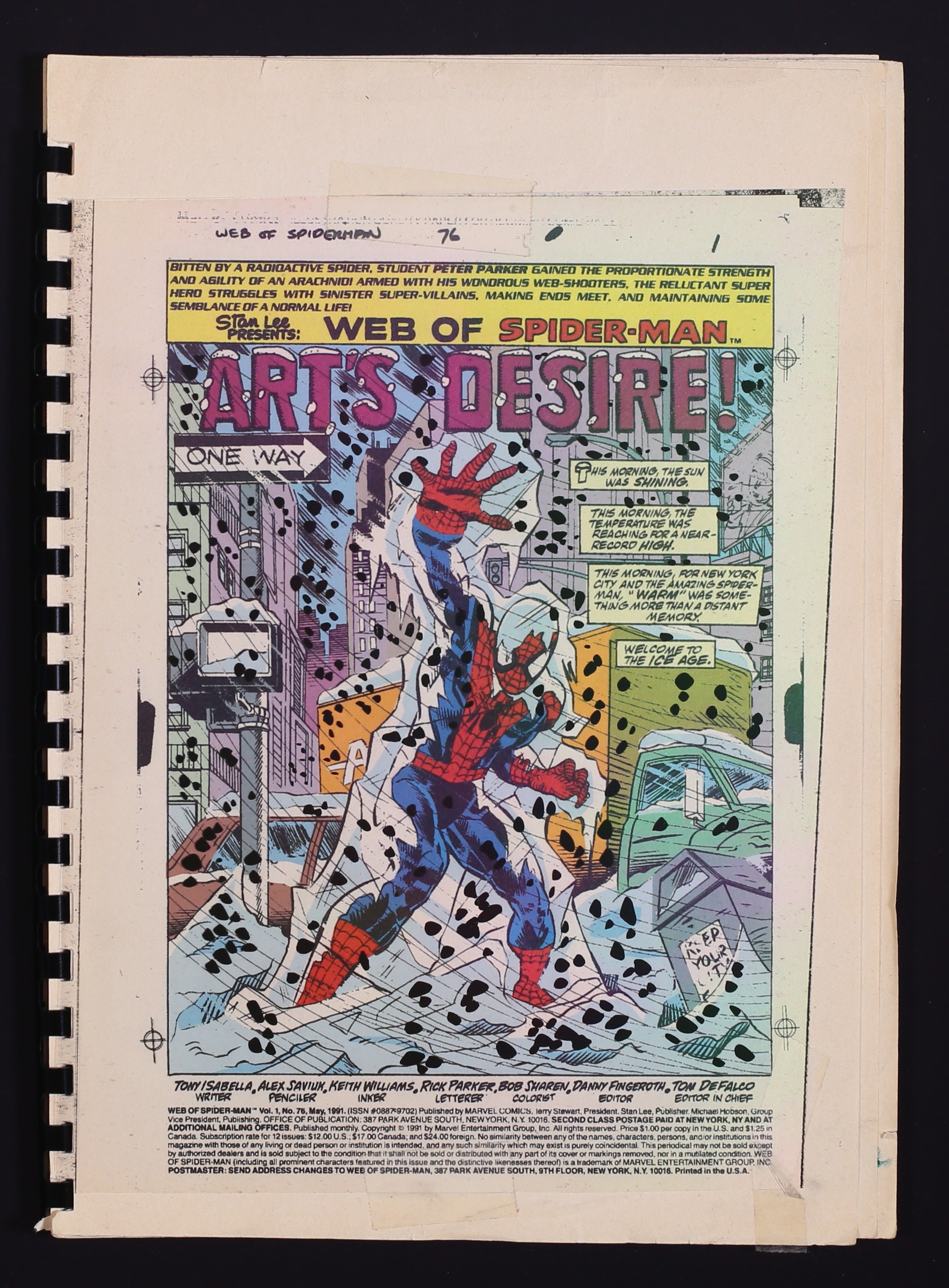 Graphic Overlay Production Pages for Web of Spider-Man (1985) #76. 23 paper comb-bound pages, the majority of which have an acetate overlay providing the 'snow' effects in the art. 8 1/2" x 11 3/4". NOTE: Page 3 is detached.