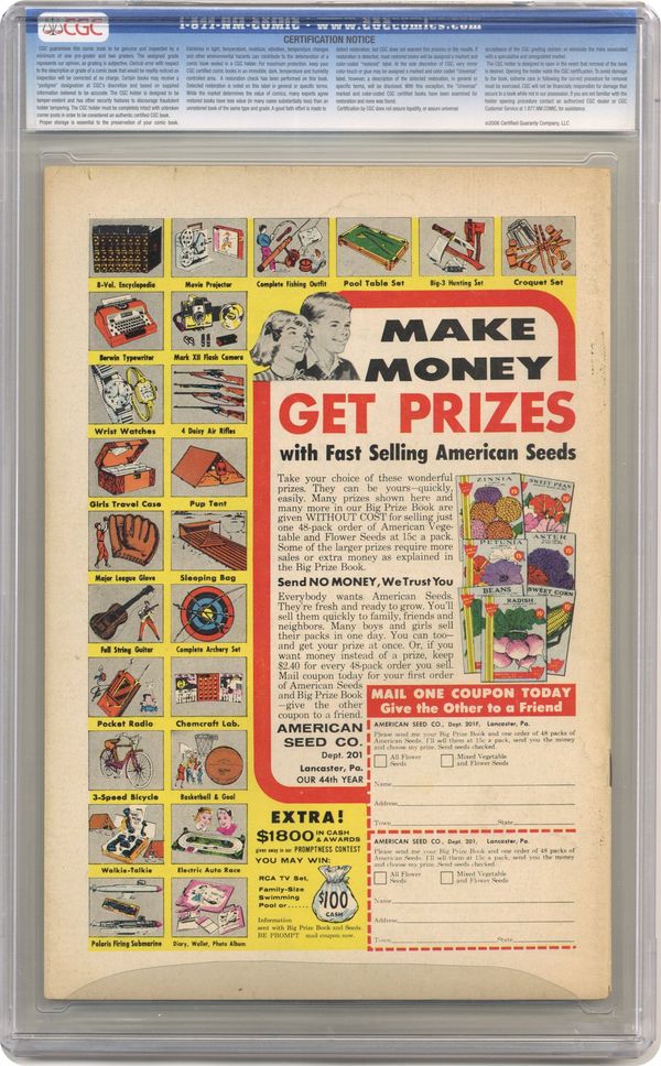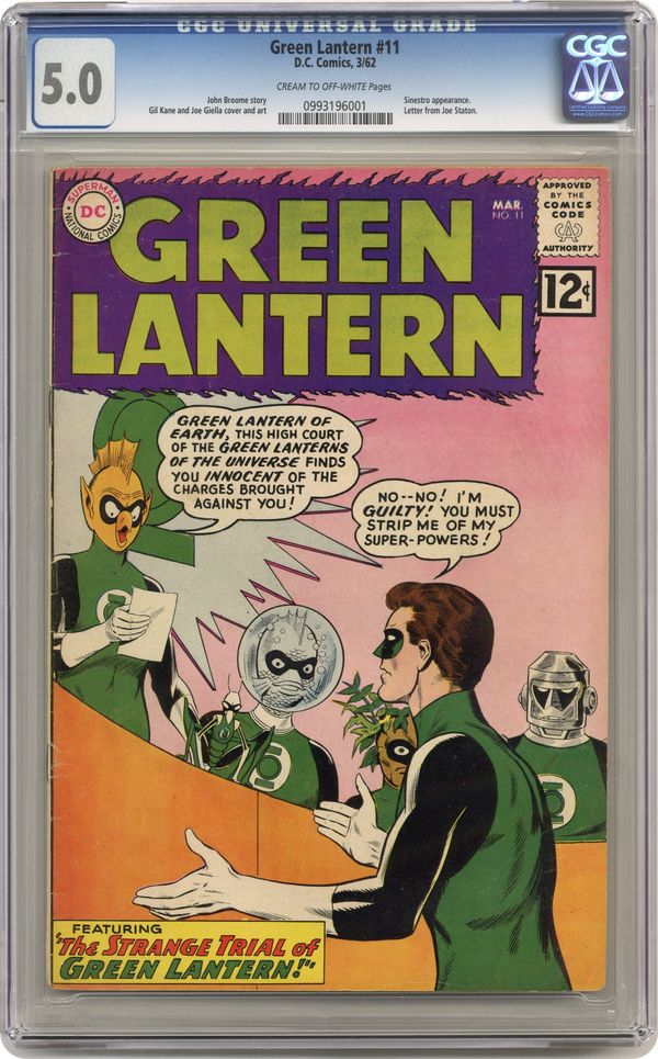 Cover pencils by Gil Kane, inks by Joe Giella. The Strange Trial of Green Lantern!, script by John Broome, pencils by Gil Kane, inks by Joe Giella; Sinestro tries to mind control Hal Jordan. Hal's behavior gets him called before the Green Lantern Corps. Trail of the Missing Power Ring!, script by John Broome, pencils by Gil Kane, inks by Joe Giella; Hal Jordan loses his power ring and it's found by a child. Letter to the editor from comic artist Joe Staton. 36 pgs. $0.12. Cover price $0.12. Grade: CGC 5.0 explanation of grade Condition: Used (collectible)