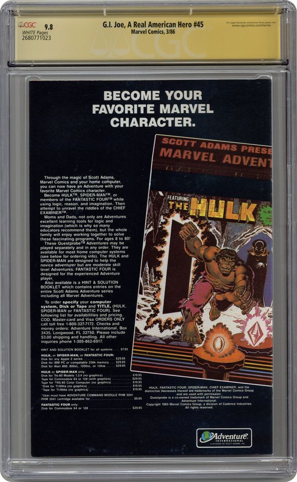First printing. Direct Edition. "In Search of Candy!" - Written by Larry Hama. Art by Rod Whigham and Andy Mushynsky. Cover by Mike Zeck. On Cobra Island, Rip-Cord finds himself in a deadly game of cat and mouse with Cobra's top assassin - Zartan. Meanwhile, Snake-Eyes and Storm Shadow team-up to discover the identity of the man who murdered their master. 32 pages, FC. NOTE: 1st appearance of Quick Kick. Cover price $0.75. Grade: CGC 9.8 explanation of grade Condition: Used (collectible)