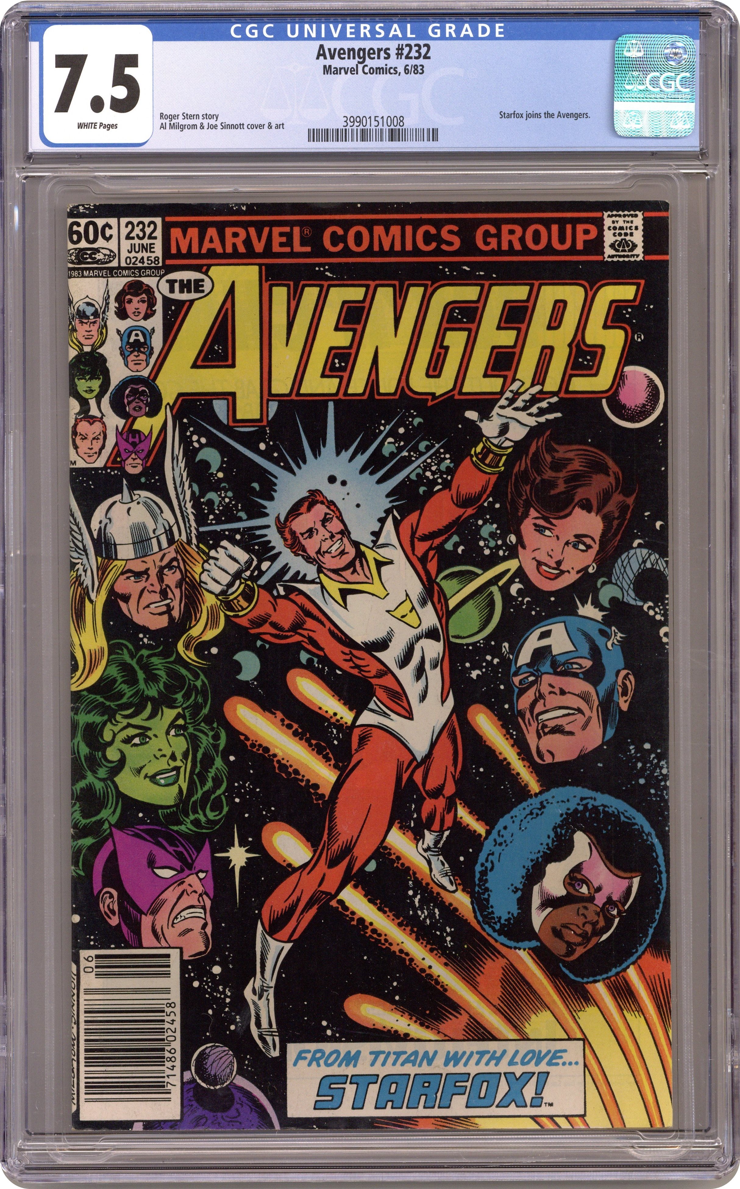 "And Now Starfox!" Part 2 of 2. Script by Roger Stern. Pencils by Al Milgrom. Inks by Joe Sinnott and crew. Cover by Al Milgrom and Joe Sinnott. Starfox wants to join the Avengers! But he will have to undergo training first! And chasing down the Plantman will be an excellent start! To that end Captain Marvel, Thor, and Starfox (aka Eros from Titan) link up with a Naval Task Force to capture the Plantman! However, the elusive villain and his submarine are cruising the depths of the Atlantic Ocean floor! Are the three avengers ready to go deep sea fishing...for the Plantman? Meanwhile, the shield-slinger and the Wasp pay a visit to an inebriated Tony Stark and surprisingly learn that someone else is now wearing the famous red and gold armor. Cameo appearances by Iron Man (aka Jim Rhodes) and the Wizard. 36 pages Cover price $0.60. Grade: CGC 7.5 explanation of grade Condition: Used (collectible)