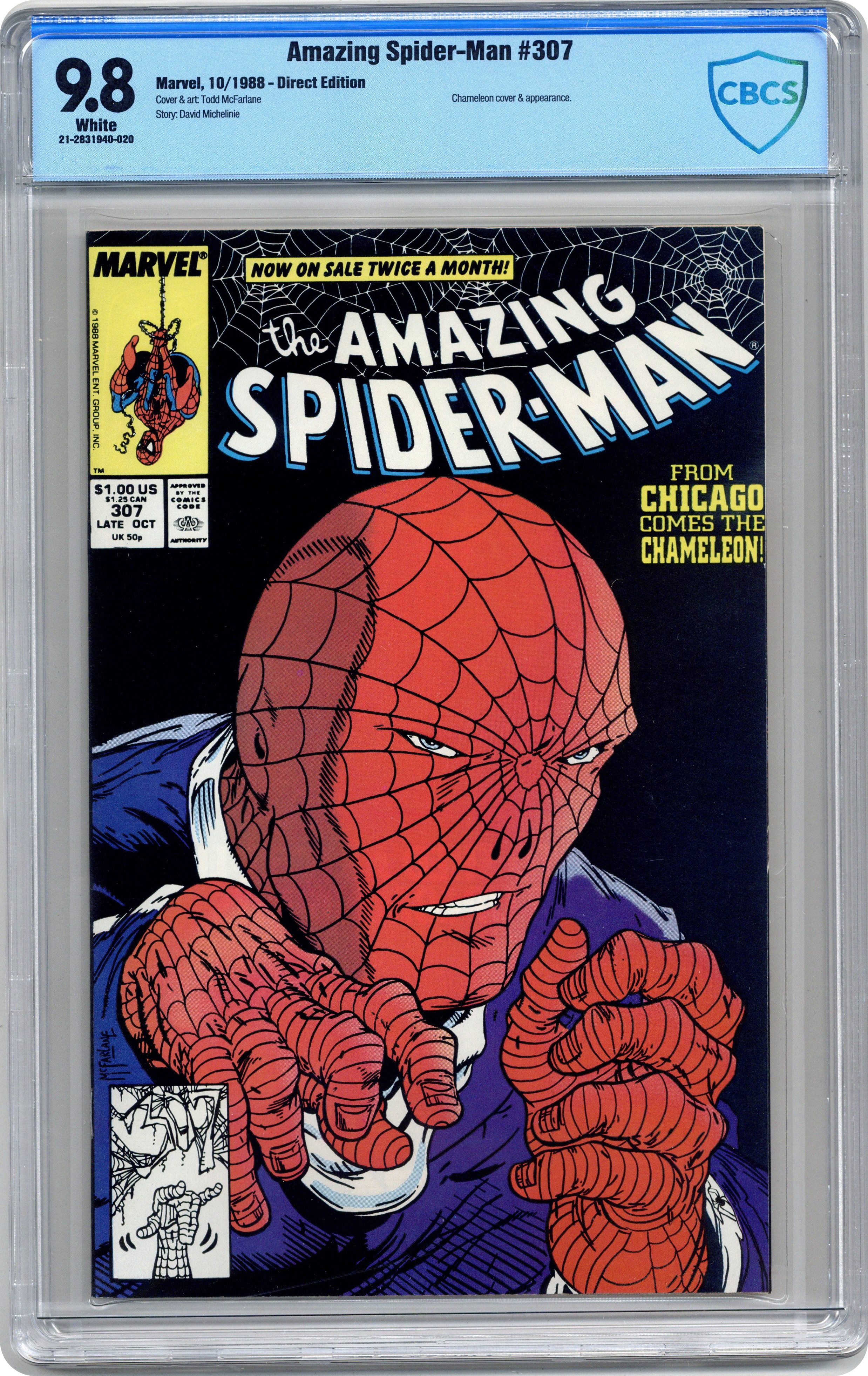 Direct Edition. "The Thief Who Stole Himself!" Script by David Michelinie. Art by Todd McFarlane. Cover by Todd McFarlane. Peter Parker's next stop on his book signing tour is the Windy City! This should be a quick and easy trip to Chicago for the web-slinger! However an old foe from long, long ago elects to embark on a new criminal career in the second city! Can the amazing one capture the Chameleon before his next endeavor begins? Spidey will have to spot him first! In the meantime back in Manhattan, the deranged Jonathan Caesar makes his move on Mary Jane! Hurry home Spider-Man! (Note: The Chameleon previously battled the wall-crawler in Amazing Spider-Man 186.) 36 pages. Cover price $1.00. Grade: CBCS 9.8 explanation of grade Condition: Used (collectible)