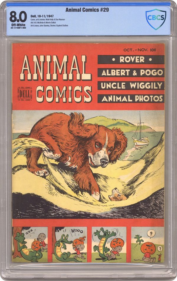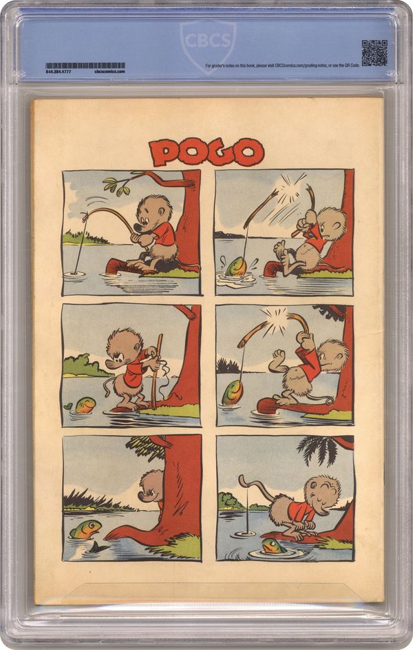 Ended Apr 10 2023 Winning Bid $105 Cover by Walt Kelly and Dan Noonan. Stories and art by Walt Kelly, John Stanley, Hubbell R. McBride, Morris Gollub, Warren W. McSpadden, George E. Clough, Dan Noonan and Gaylord Du Bois (credited as Howard R. Garis). Dell's classic funny-animal series included early work by former Disney animator Walt Kelly, creator of beloved comic strip Pogo. In an early Pogo story by Kelly, Owl wants Pogo to be the assistant in his new knife-throwing act. In another Kelly story, Pogo's fishing pole breaks; luckily, he's still got his tail. Mooch the dog tries to bury a bone, in a story by John Stanley of Little Lulu fame. Rover: The Reunion; Jigg and Mooch; Albert & Pogo; Chuckwagon Charlie; Stop that Bear; Nibble & Nubble; Uncle Wiggily. 48 Pages, Full Color. Cover price $0.10. Grade: CBCS 8.0 explanation of grade Condition: Used (collectible)