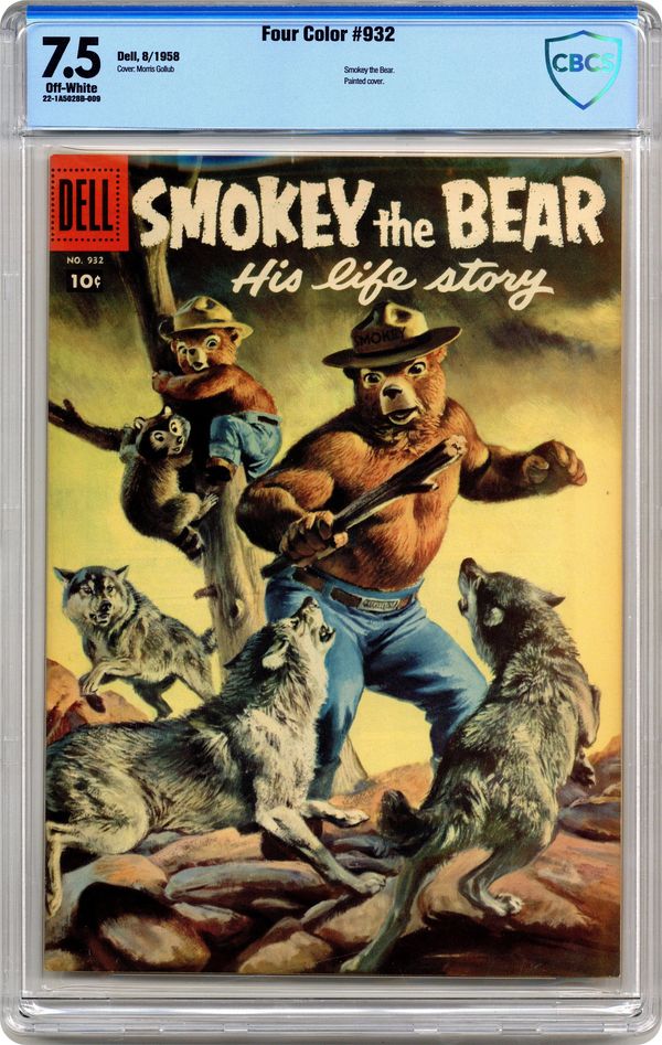 Ended Aug 8 2022 Winning Bid $52 Art on back cover. Indicia title is "SMOKEY THE BEAR, No. 932." Painted cover art by Morris Gollub. Introduction with photographs of the real-life Smokey, a bear cub who survived a forest fire. The True Story of Smokey; The true story of a bear cub that survived a deadly forest fire in New Mexico and became the mascot for the Forest Service's campaign to prevent forest fires. The Mountain Mission; Specs and Little Smokey go mountain-climbing to measure the snow depth. Building a Cabin; Smokey gets too much help from the forest animals as he tries to build a trail cabin. 36 pages, full color. Cover price $0.10. Grade: CBCS 7.5 explanation of grade Condition: Used (collectible)