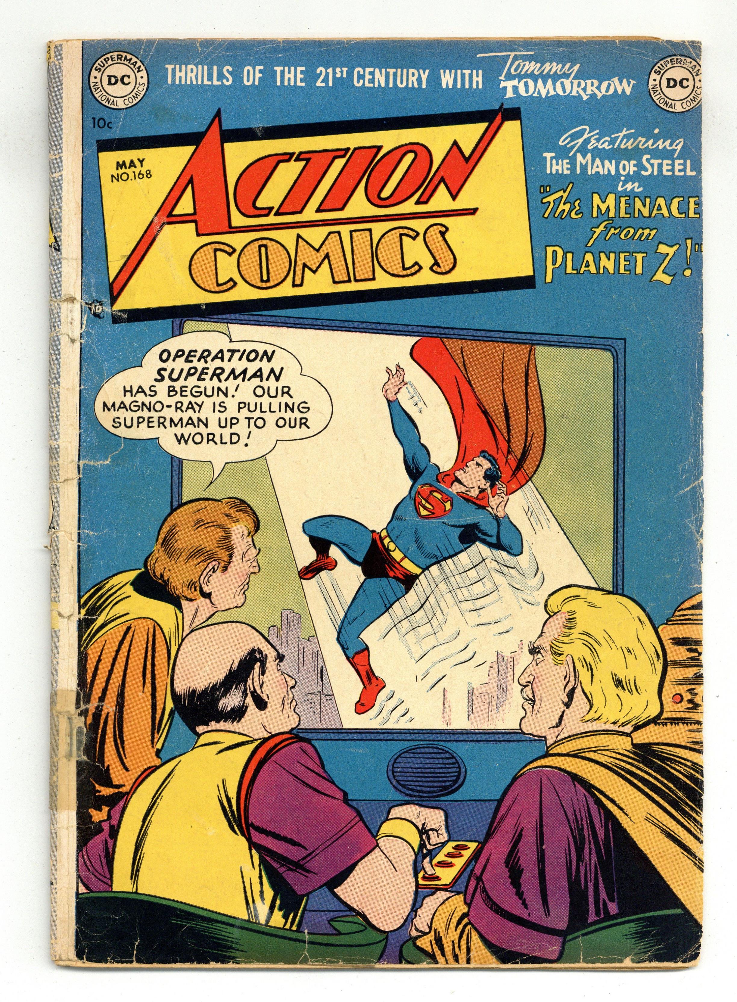 Cover art by Win Mortimer. Happy Hobby Time! public service announcement starring Superboy, script by Jack Schiff, art by Win Mortimer. The Menace of Planet Z starring Superman, script by Bill Finger, pencils by Wayne Boring, inks by Stan Kaye. The Meteor Mystery starring Tommy Tomorrow, pencils by Curt Swan, inks by John Fischetti. Congo Bill's Last Fight, script by Jack Miller, art by Ed Smalle. Outlaws For Sale starring Vigilante, art by Bob Brown. 44 Pages, Full Color. $.10 Cited in Parade of Pleasure. Cover price $0.10. Grade: FR/GD 1.5 explanation of grade Condition: Used (collectible)