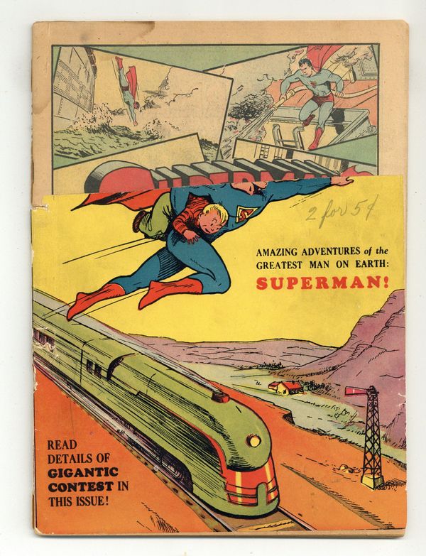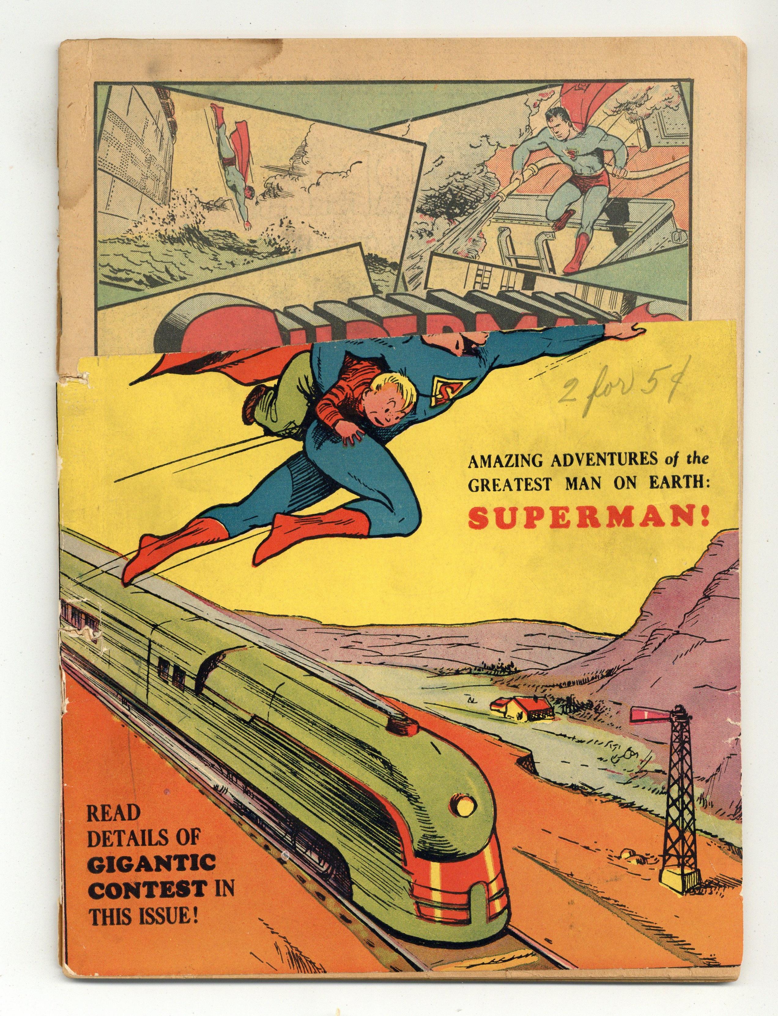 Cover art by Joe Shuster. Untitled Superman story, script by Jerry Siegel, pencils by Joe Shuster, inks by Dennis Neville [as Joe Shuster]; When Superman saves a runaway boy from being run over by a train, he discovers the child is from an orphanage where the superintendent abuses the children in a variety of ways. Supermen of America club contest. Untitled Superman story, art by Jerry Siegel; Although Lois has double-crossed him and editor Taylor has fired him, Clark Kent (as Superman) heads to the Valley-Ho Dam to prevent it from collapsing. Death By the Stars text story, script by Bert Lexington, art by Fred Guardineer. Untitled Superman story, script by Jerry Siegel, art by Joe Shuster; Clark Kent is introduced to a fighter manager who claims to be Superman's personal manager. Acquiring Super-Strength muscle training tips. Attaining Super-Health: A Few Hints From Superman! Good Luck Charm text story, script by Hugh Langley, art by Fred Guardineer. Untitled Superman story, script by Jerry Siegel, pencils by Joe Shuster, inks by Paul Cassidy [as Joe Shuster]; Superman must save Lois' life and stop criminals who are smuggling in jewels from Europeans who wish to escape paying custom duties. 68 Pages, Full Color. Cover price $0.10. Grade: PR 0.5 explanation of grade Condition: Used (collectible)