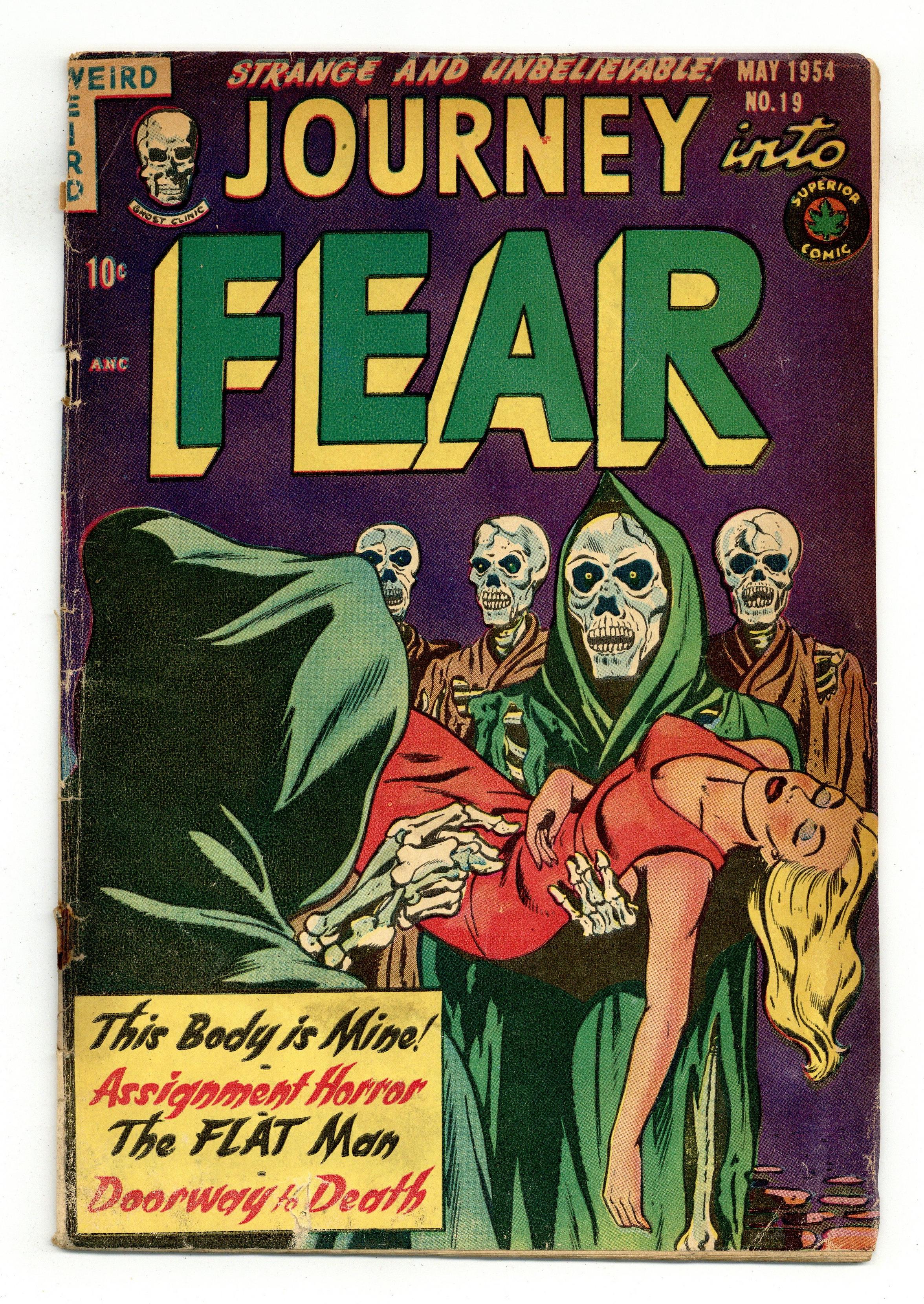 Doorway to Death; Art collector Guy Stevens buys a large painting of a castle and discovers that he can open the door in the painting; He begins murdering people and hiding their bodies in the painting. Assignment Horror; Harold goes to an ad agency to promote a movie about giant frogs that conquer the world. Sacrifice to Kaste text story. This Body is Mine! The Flat Man; A man becomes the Flat Man by being run over by a bulldozer. 36 pgs. $0.10. Cover price $0.10. Grade: FR/GD 1.5 explanation of grade Condition: Used (collectible)