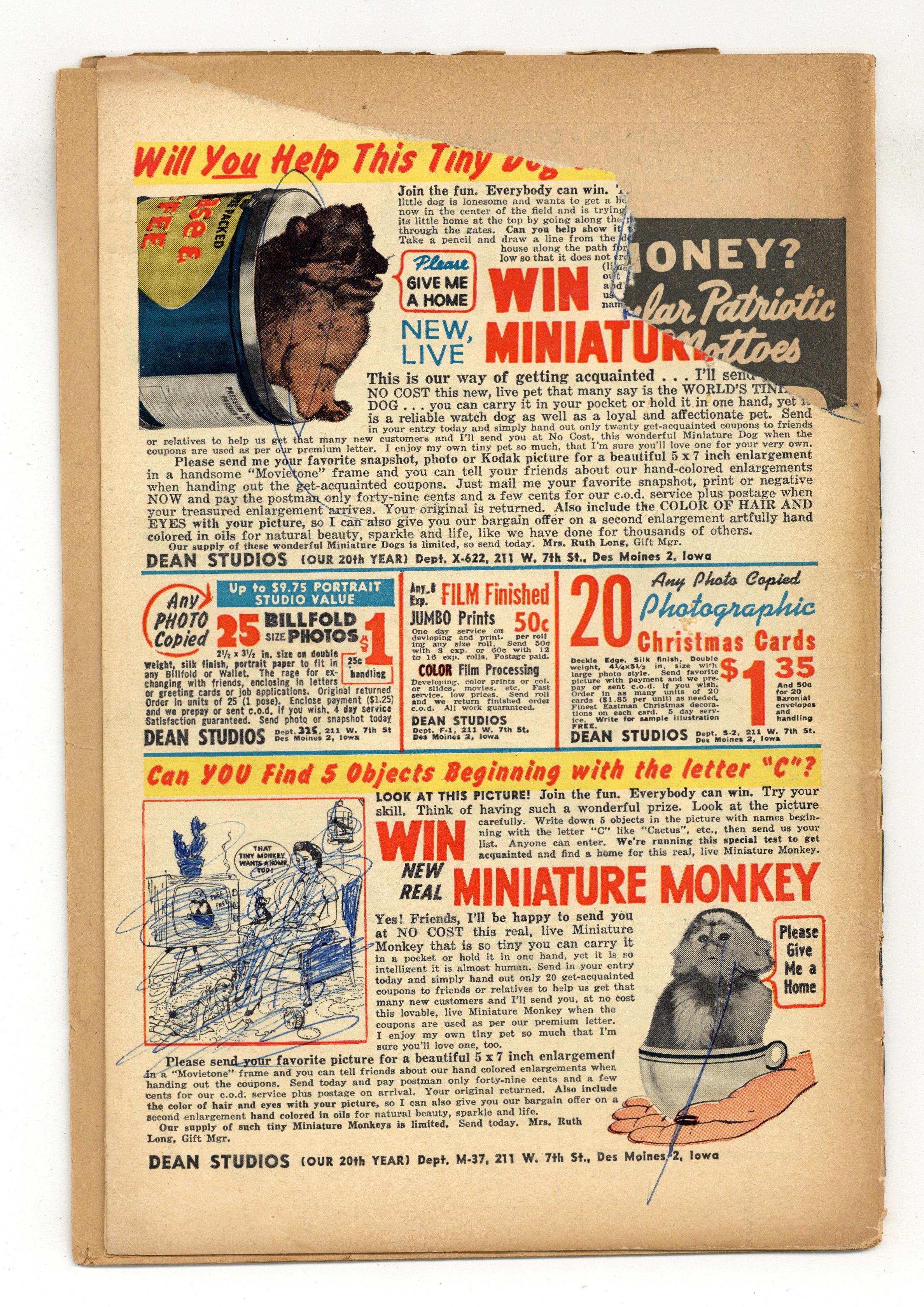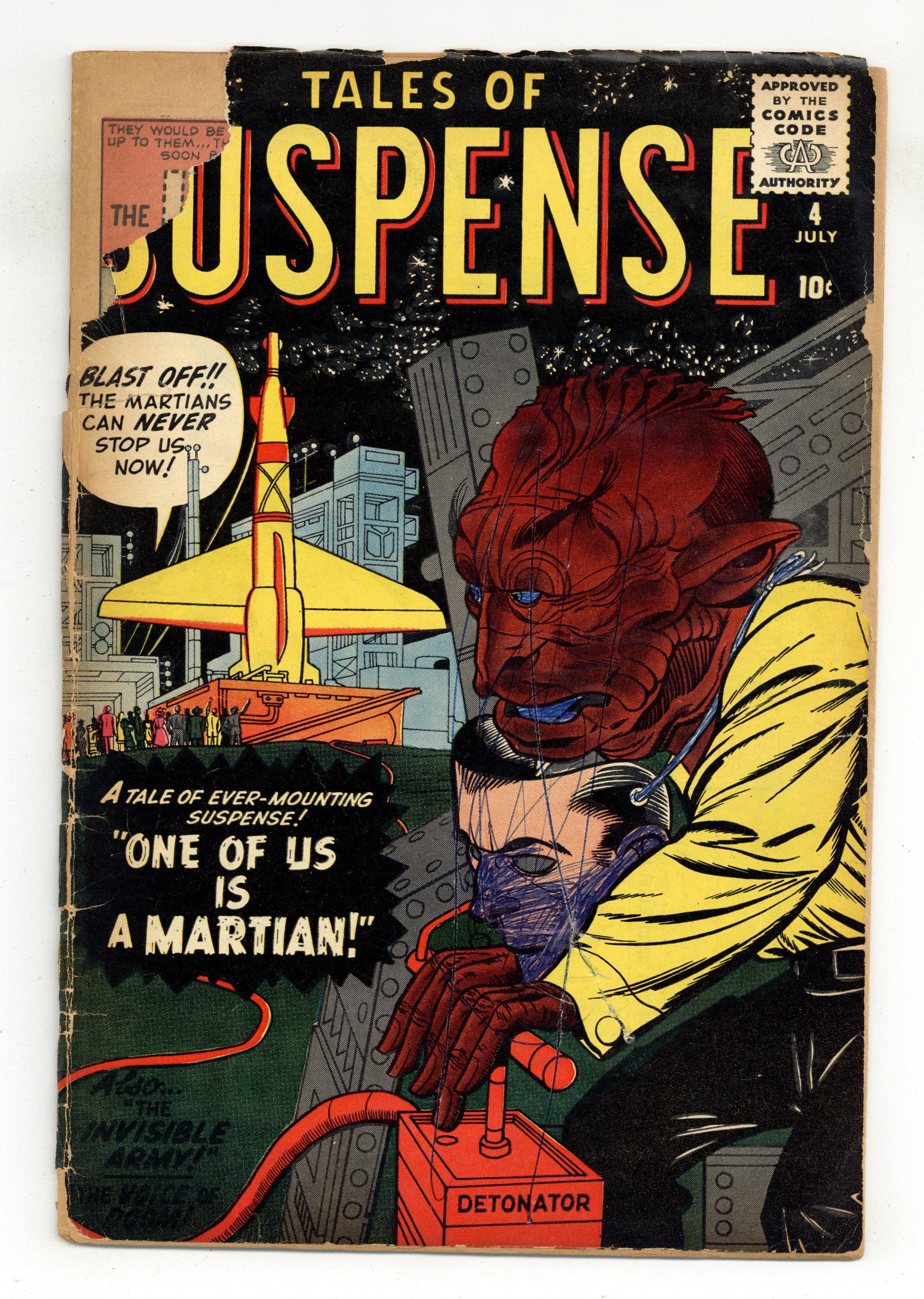 Cover pencils by Jack Kirby, inks by Christopher Rule. "The Invisible Army," art by Joe Sinnott; A scientist is forced to work for a dictator but, instead of creating an invisibility ray as ordered, creates a teleportation ray that banishes his top officers and allows a revolution. "Snowstorm" text story. "One of Our Spacemen Is Missing!", pencils by Jack Kirby, inks by Christopher Rule; A space explorer ignores his partner's caution and leads a party out into a seemingly safe world; They all disappear, captured by intelligent trees, and the more cautious explorer rescues them. "The Voice of Doom!", art by Carl Burgos; A ham radio operator believes he is receiving reports of an extraterrestrial battle, but he is actually receiving the thought waves of ants. "Beware of the... Robots!", art by Al Williamson; A man writes anti-robot articles about his replacement at a factory by a robot; He becomes a famous writer, and realizes that the robot actually freed him to pursue his true calling. "One of Us Is a Martian!", art by Steve Ditko; A Martian spy is sent to sabotage a human rocket, but he destroys a toy instead, since Martians are only an inch tall. 36 pages, full color. Cover price $0.10. Grade: FR 1.0 explanation of grade Condition: Used (collectible)