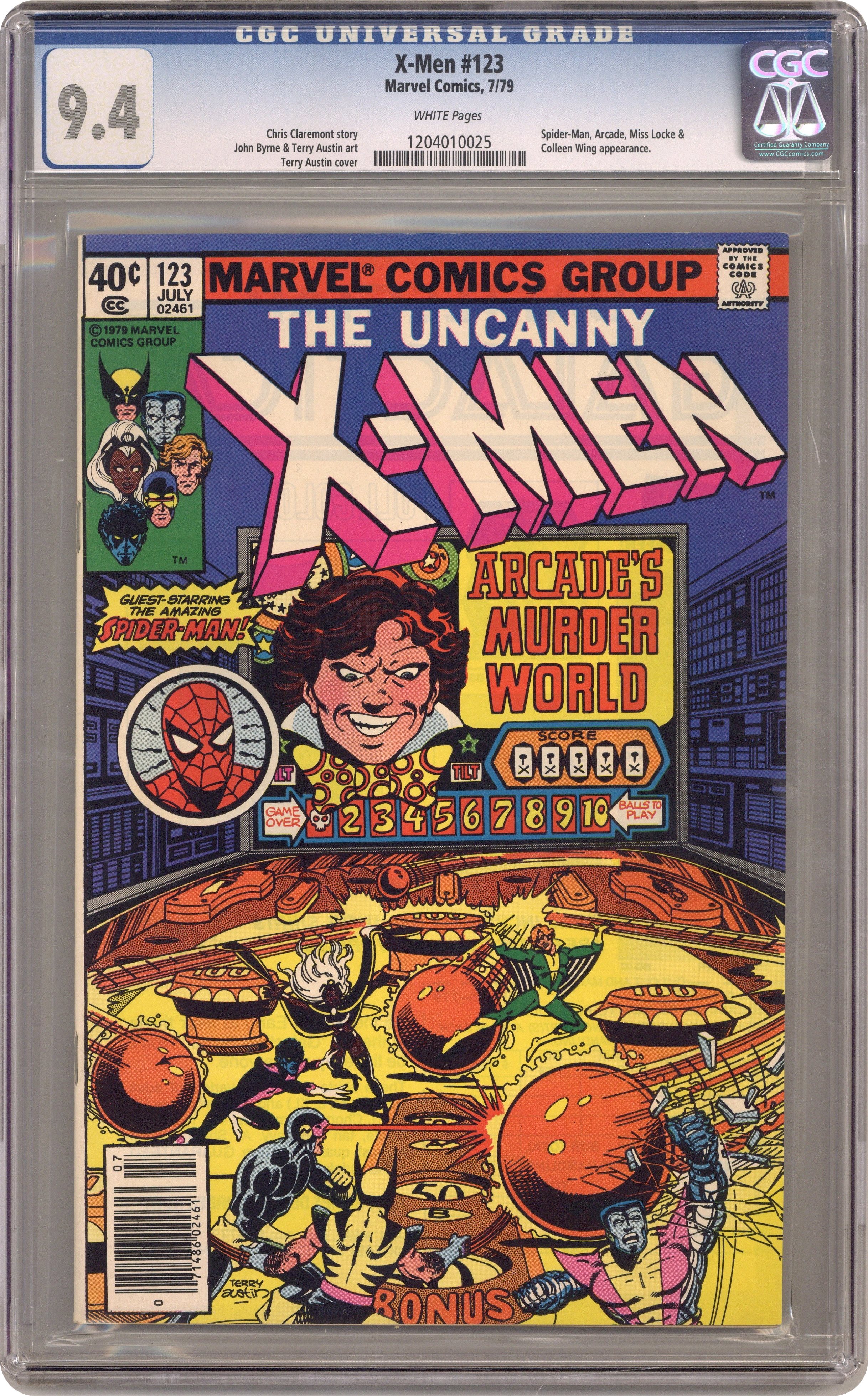 Ended Oct 12 2023 Winning Bid $58 Direct Edition. "Listen - Stop Me if You've Heard It - But this One will Kill You!" Part 1 of 2. Guest-starring Spider-Man and Colleen Wing. Story by Chris Claremont and John Byrne. Art by John Byrne and Terry Austin. Cover by Terry Austin. One by one the X-Men are abducted. Now they must fight for their lives if they hope to survive the sinister creature of the diabolical Arcade - Murder World! NOTE: Uncanny X-Men #123 and #142 are rare commodities in the realm of comics as they are two of the very few covers where inker extraordinaire Terry Austin actually does the pencils as well. - Odinson Lone Star Comics Archivist. 36 pgs. Cover price $0.40. Grade: CGC 9.4 explanation of grade Condition: Used (collectible)
