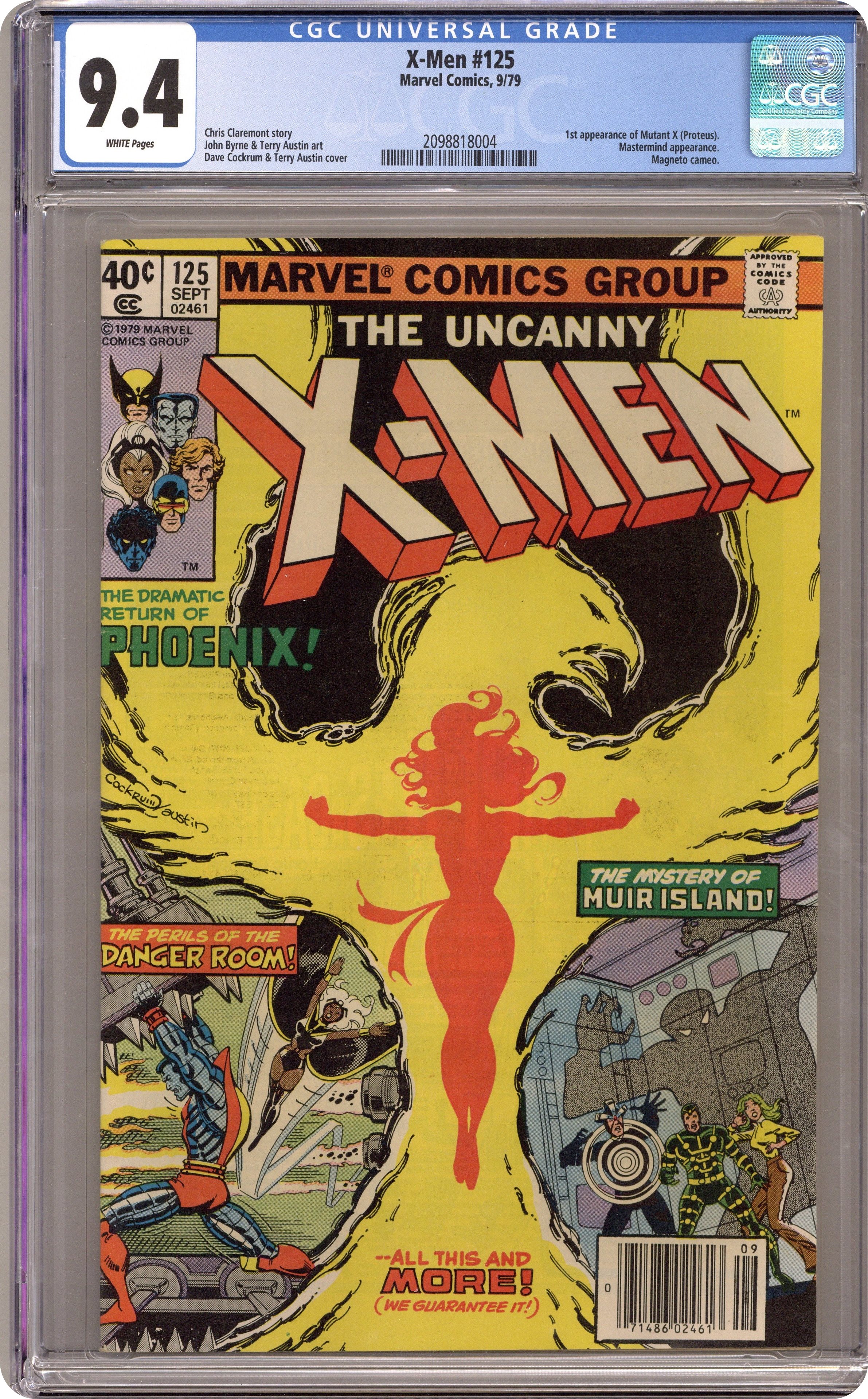Ended Oct 27 2023 Winning Bid $90 Direct Edition. As the cover says: the dramatic return of Phoenix! "There's Something Awful on Muir Island!" "...!" Story by Chris Claremont and John Byrne. Art by John Byrne and Terry Austin. First appearance of Mutant X (Proteus). 36 pgs. Cover price $0.40. Grade: CGC 9.4 explanation of grade Condition: Used (collectible)