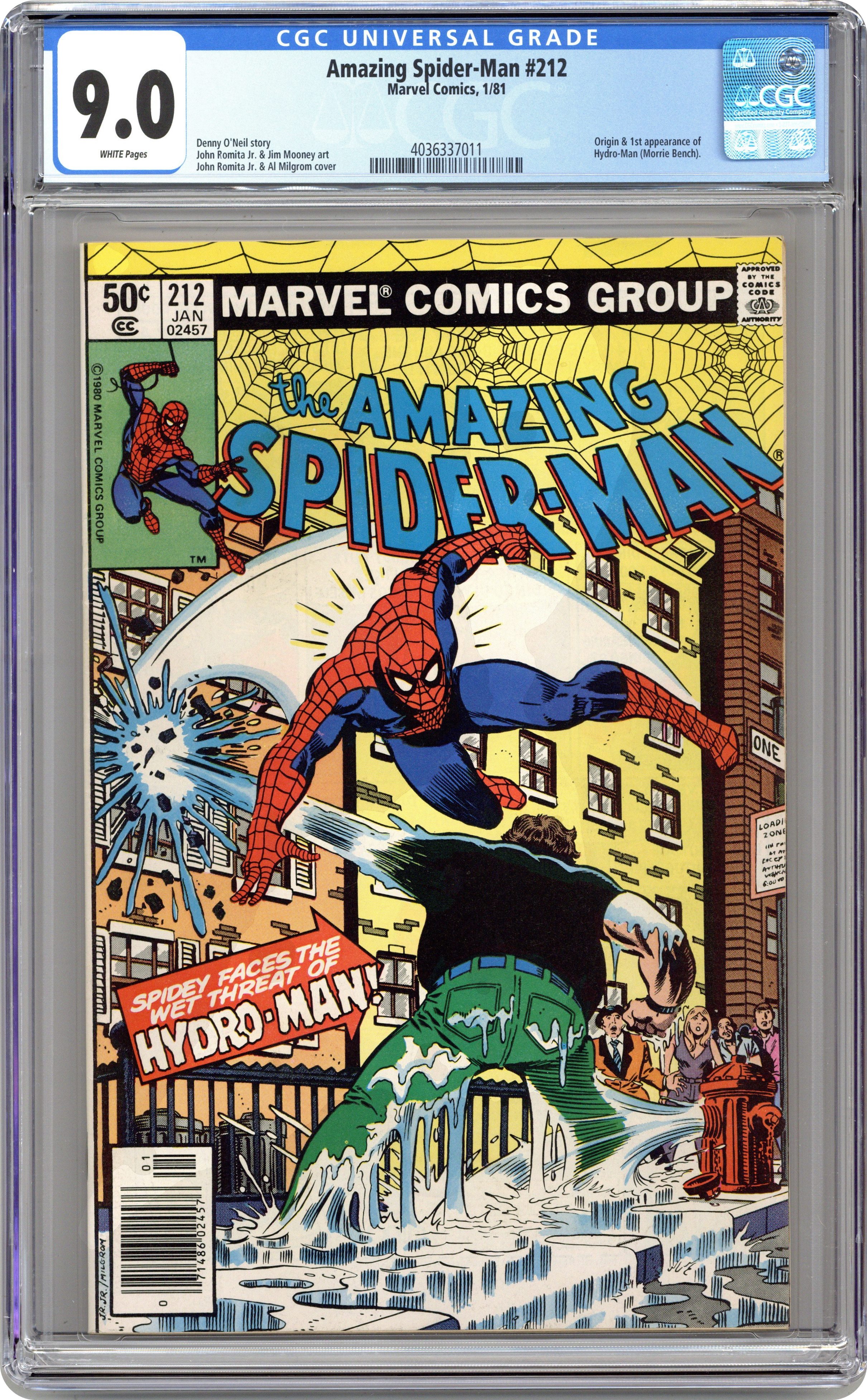 Ended Aug 16 2022 Winning Bid $53 Direct Edition. "The Coming of Hydroman!" First appearance of Hydro-Man. Script by Denny O'Neil. Art by John Romita Jr. (breakdowns) and Jim Mooney (finishes). Cover by John Romita Jr. and Al Milgrom. The adventure with the Sub-Mariner is over! And now the cargo ship with the wall-crawling escort heads back into port. But before the vessel can dock, a bizarre accident sends a crewmember tumbling overboard near an experimental undersea generator! And instantly a new super-villain is born...Hydro-Man! Shortly thereafter Morrie Bench (aka Hydro-Man) starts settling scores with old enemies across the city! And Spider-Man is on his list! At high noon atop an NYC office building, Hydro-Man tries to drown the web-slinger! Does the amazing one need a life jacket? Cameo appearances by J. Jonah Jameson and Joe Robertson. (Notes: Hydro-Man returns in Amazing Spider-Man 217. This issue includes a full-page ad for Hostess Fruit Pies featuring Captain America and Nick Fury vs. the Trapster.) 36 pgs. Cover price $0.50. Grade: CGC 9.0 explanation of grade Condition: Used (collectible)