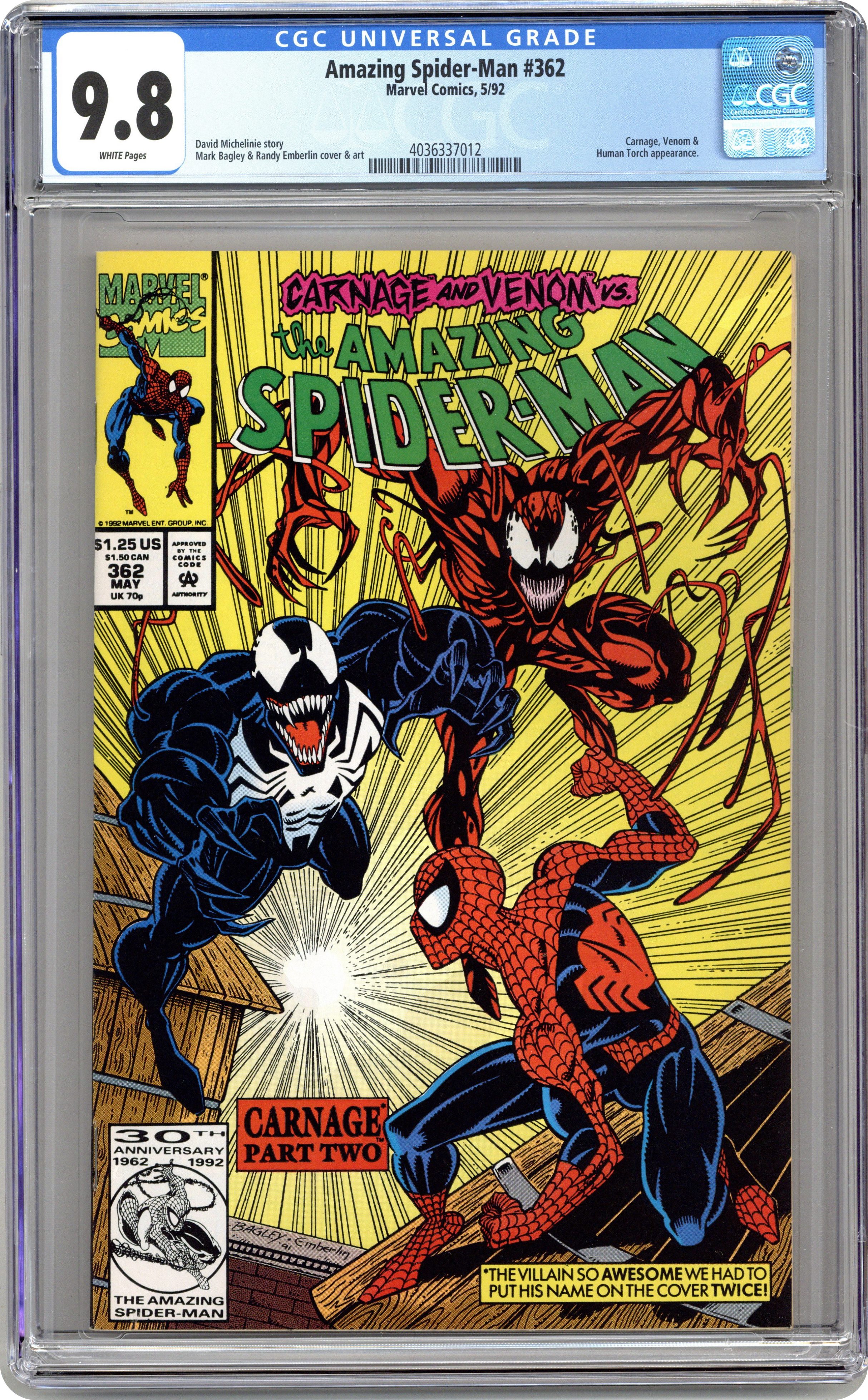 Ended Aug 16 2022 Winning Bid $87 First Printing. Direct Edition. "Savage Alliance!" Part 2 of 3. Guest-starring the Human Torch. Script by David Michelinie. Pencils by Mark Bagley. Inks by Randy Emberlin. Cover by Mark Bagley and Randy Emberlin. After getting a taste of Carnage's raw power last issue, the wall-crawler knows he needs serious help! To that end the amazing one does the unthinkable! He pays a visit to Venom! Wow, is that a good idea? However as a precaution the web-slinger brings Johnny Storm along for the ride to Venom's deserted island! And following an intense battle, Venom surprisingly agrees to help his good pal Spidey! So in a truly unlikely pairing, the Spectacular Spider-Man and the Lethal Protector join forces to take down Carnage! You have to see it to believe it! Cameo appearance by J. Jonah Jameson. (Note: The issue includes a full-page ad for the Toxic Crusaders (1992) series with art by Sam Kieth.) 36 pages. $1.25 cover price. Cover price $1.25. Grade: CGC 9.8 explanation of grade Condition: Used (collectible)