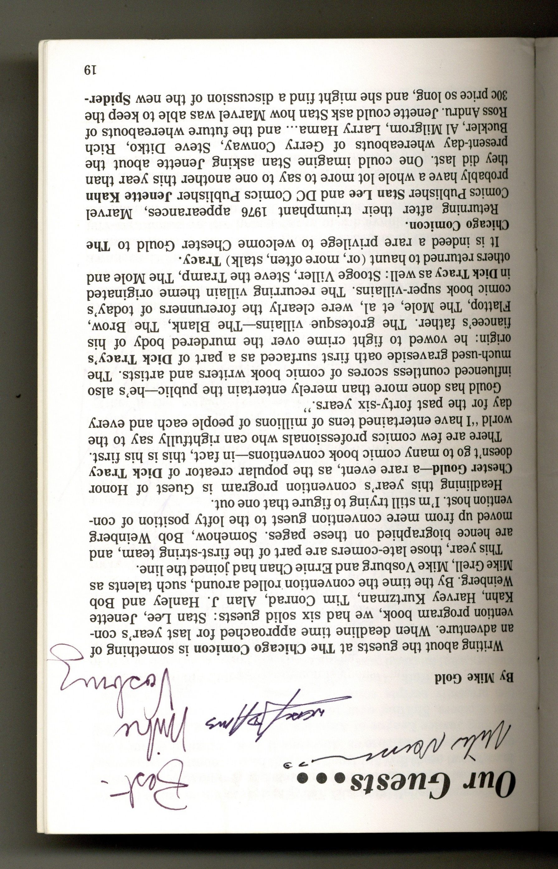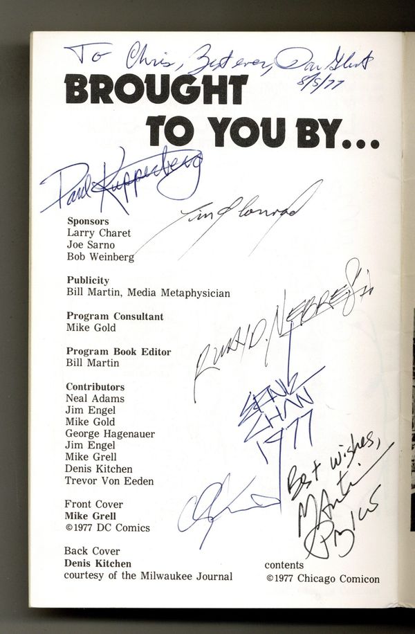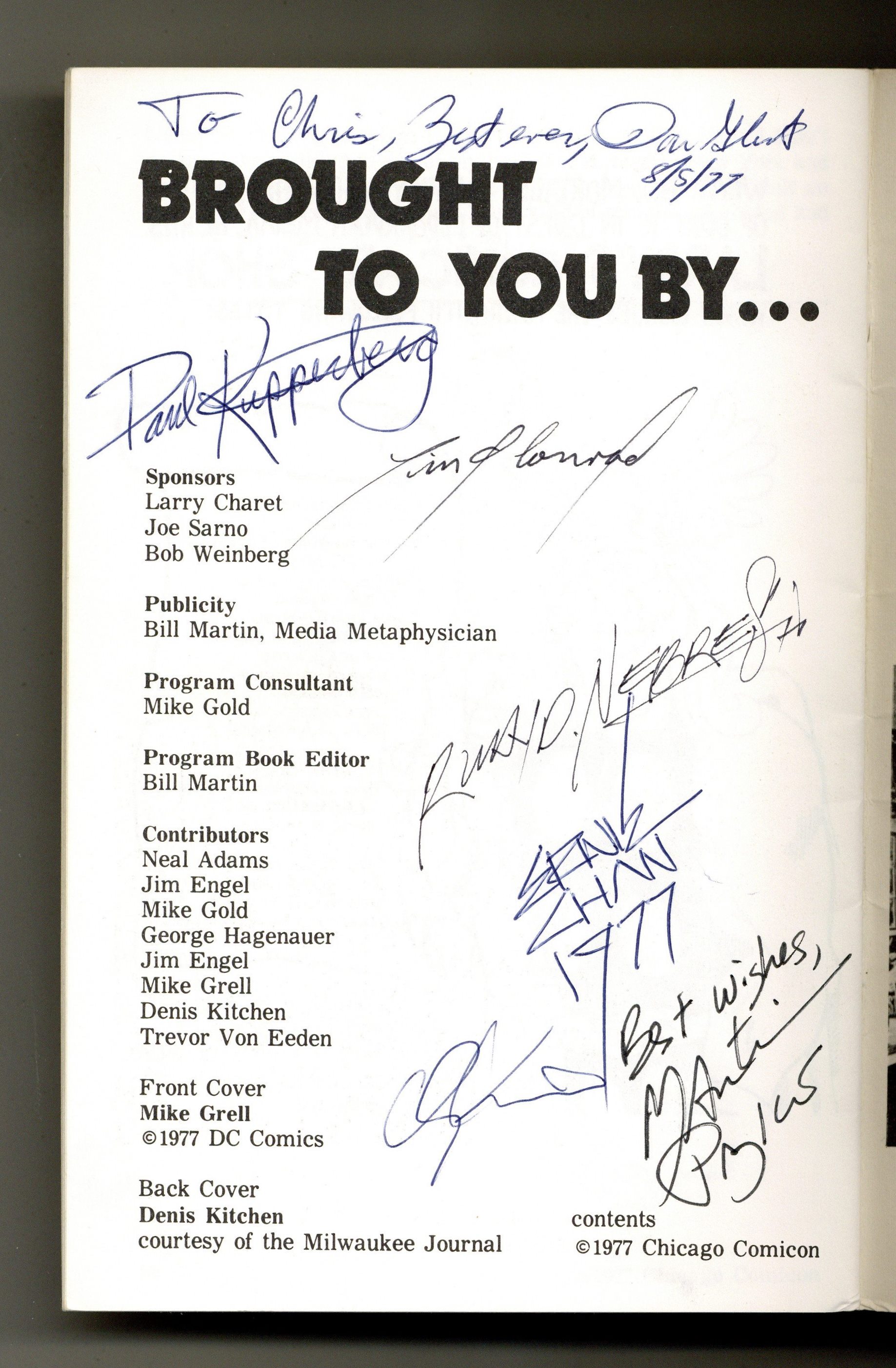 Ended Jul 31 2022 Winning Bid $281 Cover by Mike Grell. Souvenir program from the 1977 Chicago Comicon. Includes a transcript of a panel featuring Stan Lee, Jenette Kahn, and Harvey Kurtzman. Grade: FN 6.0 explanation of grade Condition: Used (collectible)