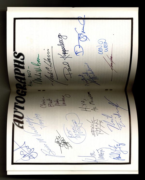 Signed by Chris Claremont, Boris Vallejo, John Byrne, Mike Vosburg, Marv Wolfman, Al Milgrom, Ernie Chan, Joe Kubert, Paul Levitz, Mike Friedrich, Mike W. Barr, Jack C. Harris, Paul Kupperberg, David Michelinie, Len Wein, Mike Grell, and Denny O'Neil. Does not include certificate of authenticity.