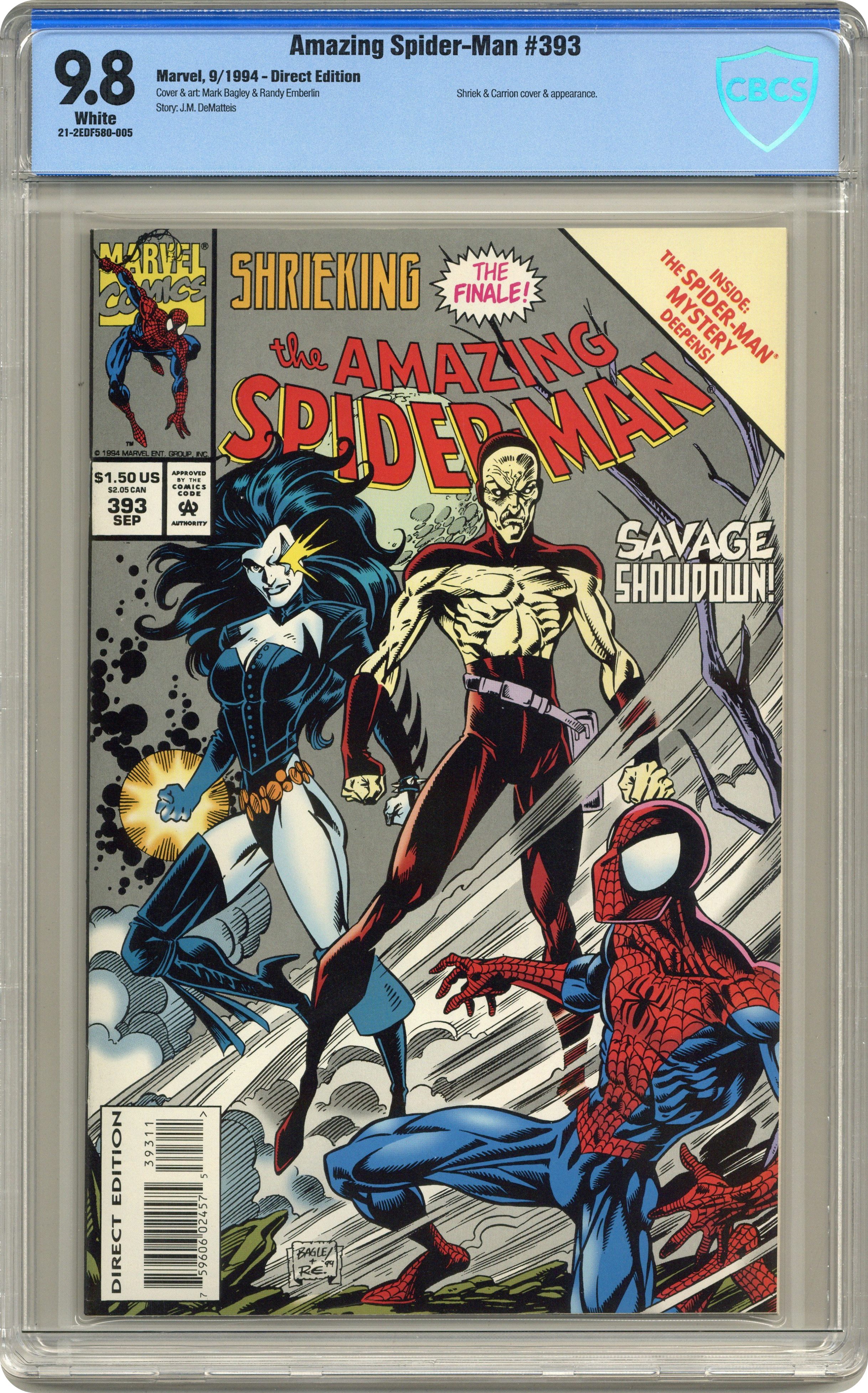 "Mother Love...Mother Hate!" Shrieking Part 4 of 4. Script by J.M. DeMatteis. Pencils by Mark Bagley. Inks by Randy Emberlin. Cover by Mark Bagley and Randy Emberlin. The Amazing Spider-Man goes shrieking for the last time! Inside Beatrice MacBride's home, the wondrous wall-crawler wages a life-and-death struggle against Shriek and Carrion! Can the spectacular one save Ms. MacBride much less himself from Shriek's violent rage and Carrion's deadly touch? A savage showdown indeed! Cameo appearances by Aunt May, Mary Jane Watson, and Ben Reilly (aka the Spider Clone). (Note: Beginning next issue, the Clone saga runs through the Amazing Spider-Man title for the next 2 years.) 36 pages. Cover price $1.50. Grade: CBCS 9.8 explanation of grade Condition: Used (collectible)